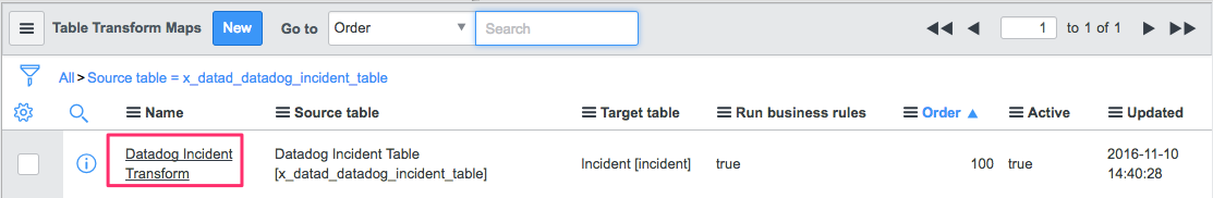 Click one of the tables (for example, Datadog Monitors ITSM Tables), and scroll to the bottom of the record to see the link for the associated transform map.