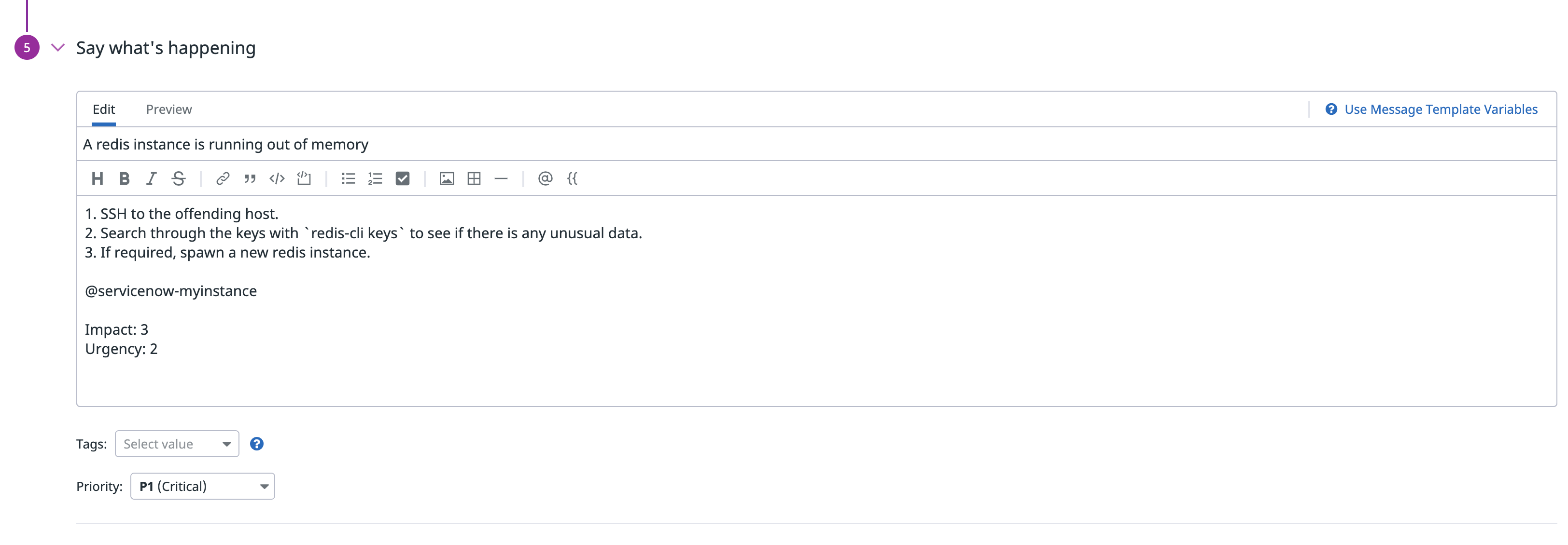What Happened | Description - String | Description | One way sync from Datadog -> ServiceNow |