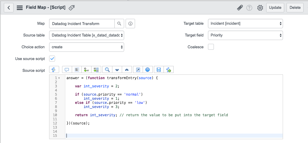 The transform maps for Datadog Cases ITOM and ITSM tables contain an example transform script that runs onBefore. By default, the script is commented out, but you can enable it by uncommenting it and modifying it to fit your use case.