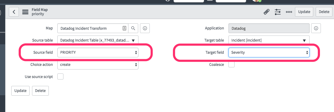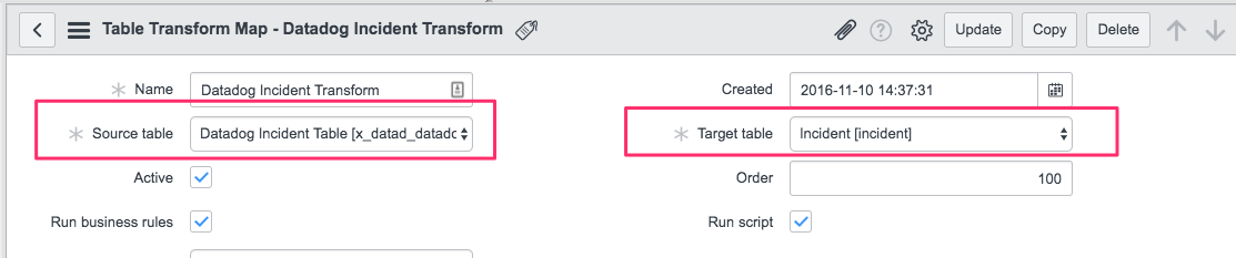 The ServiceNow integration writes from Datadog to interim tables, which transform to records in ServiceNow. For any customizations (for example, custom field mappings), you can extend the transform maps to specify what fields you want to map to from Datadog to ServiceNow.
