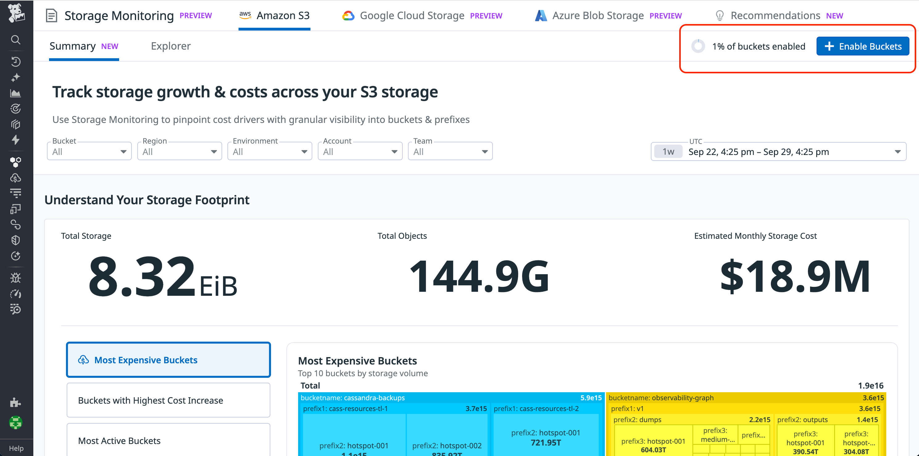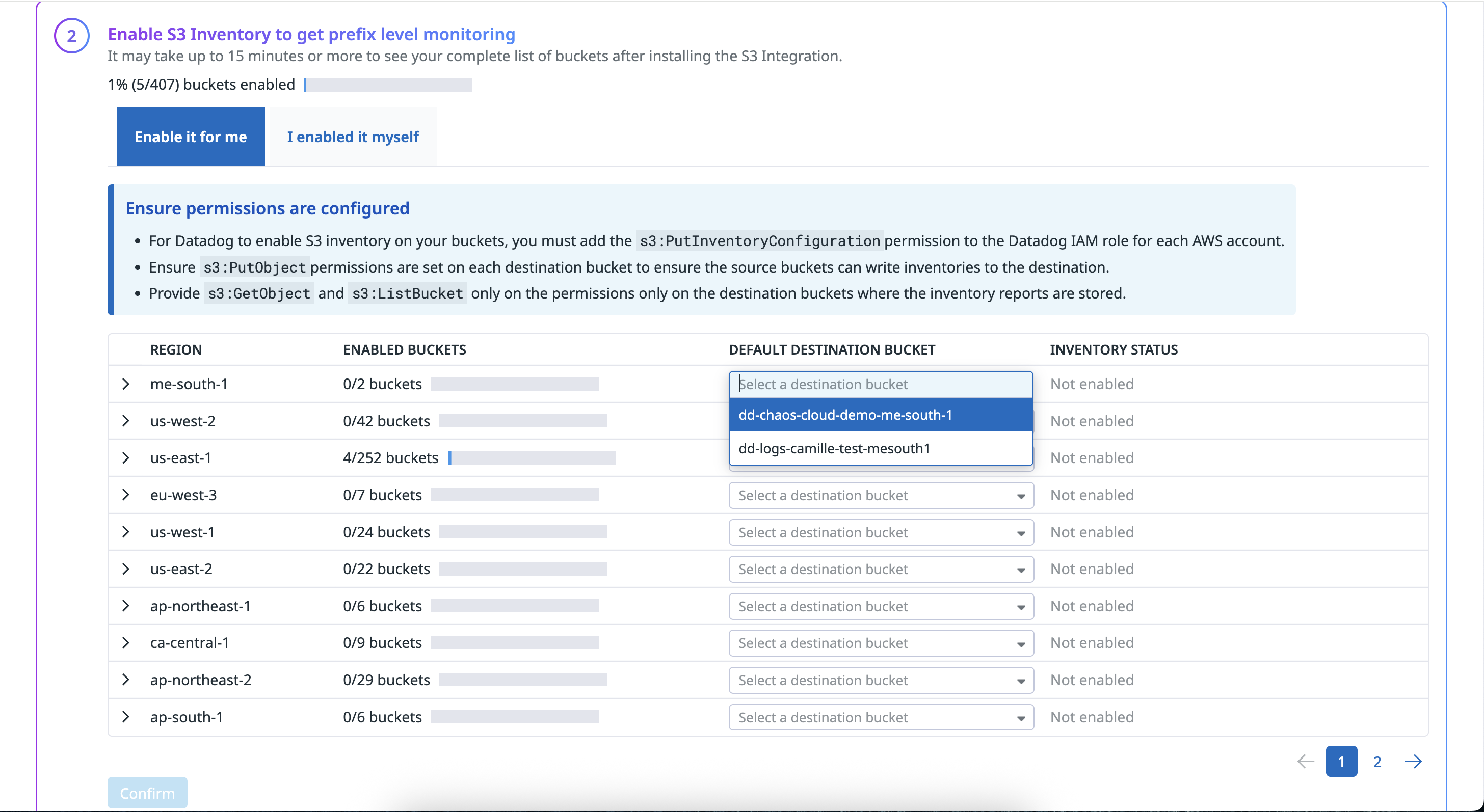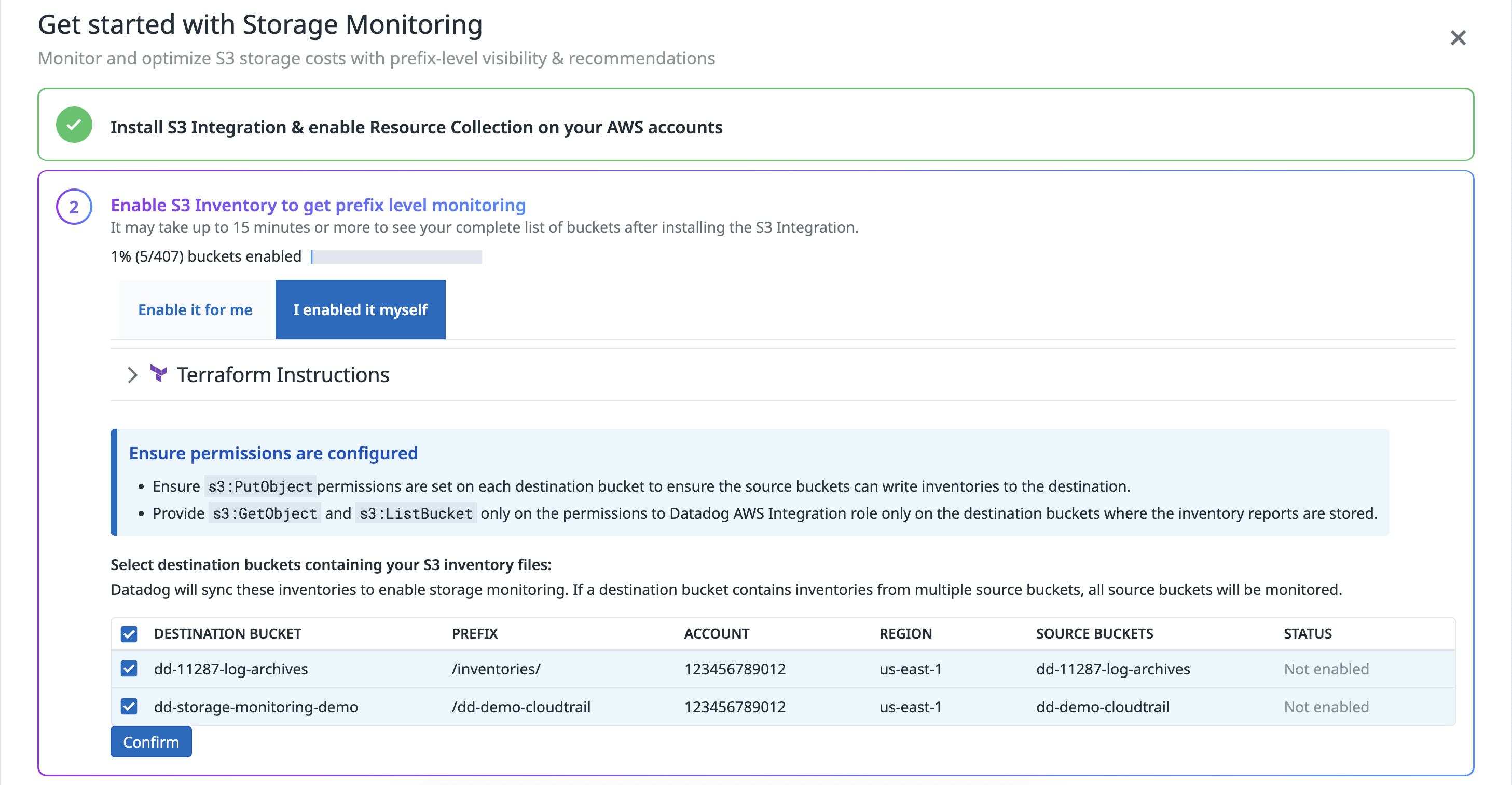 If you have already configured S3 Inventory for the buckets you want to monitor, enable buckets for Storage Monitoring from the Datadog UI: