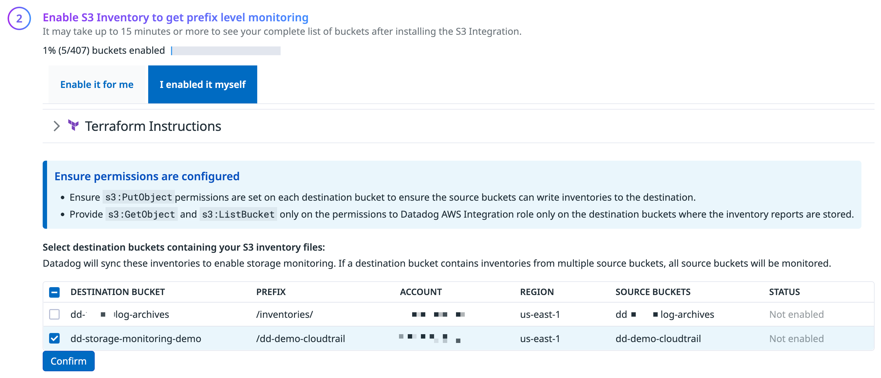 As an alternative, you can set up S3 inventory manually or with Terraform and enable Storage Monitoring using your existing setup. For details, see Existing S3 Inventory.