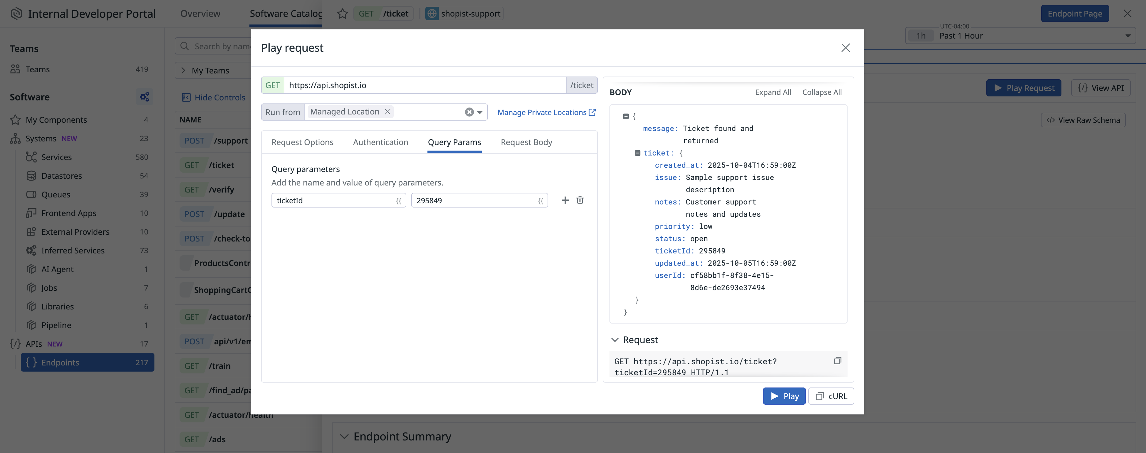 You can use the Play Request feature in Software Catalog to send test HTTP requests to your endpoints and inspect the responses.