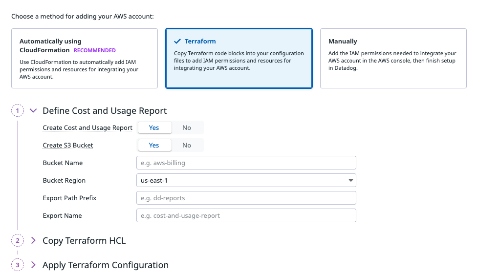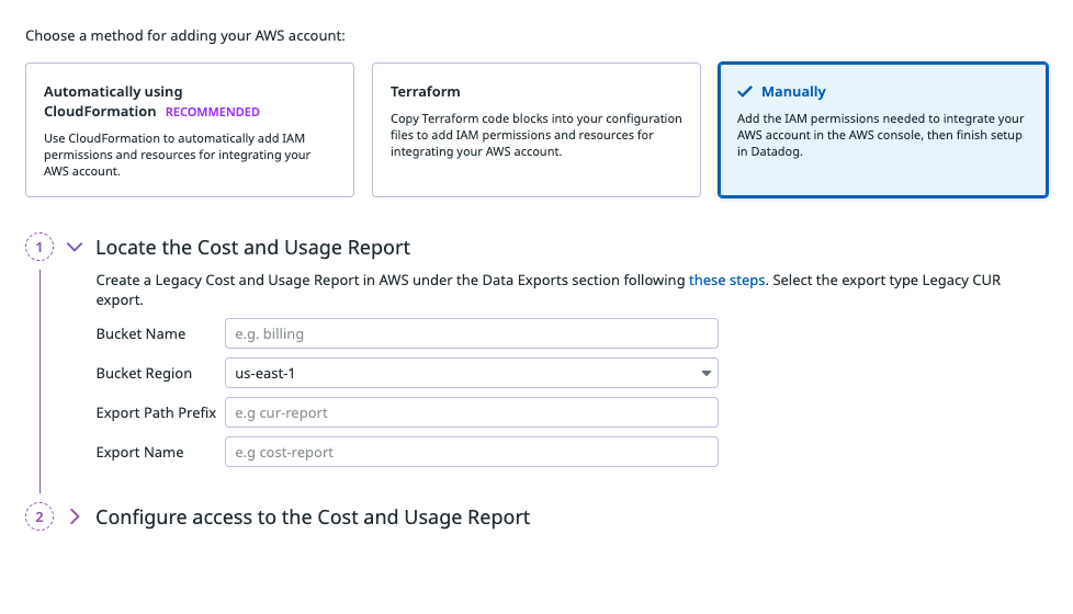 Note: Datadog recommends configuring a Cost and Usage Report from an AWS management account for cost visibility into related member accounts.