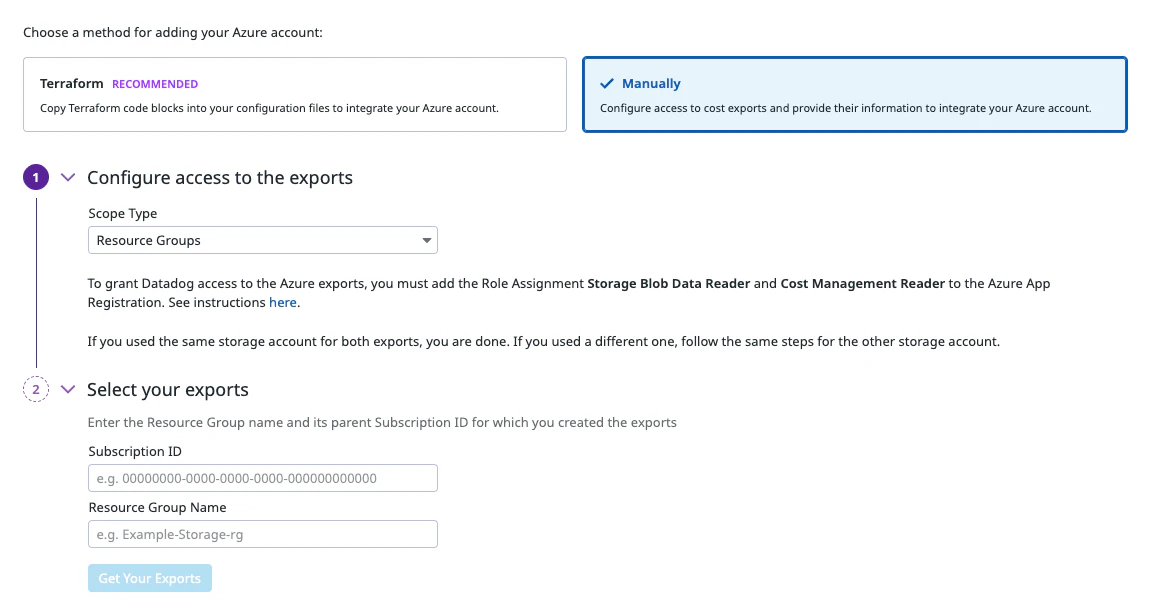 You need to generate exports for two data types: actual and amortized. Datadog recommends using the same storage container for both exports.