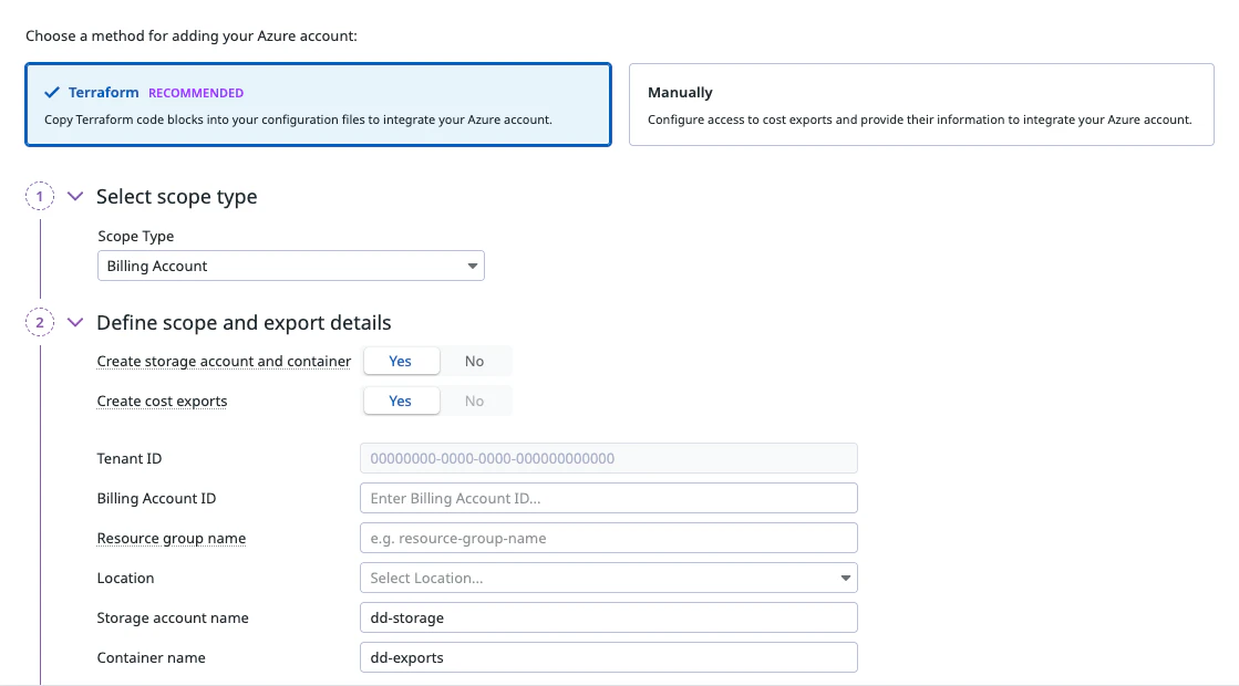To use Azure Cloud Cost Management in Datadog, you must configure the Datadog Azure integration and create amortized and actual exports in Azure. Additionally, Datadog must have permissions to read the exports from the container.