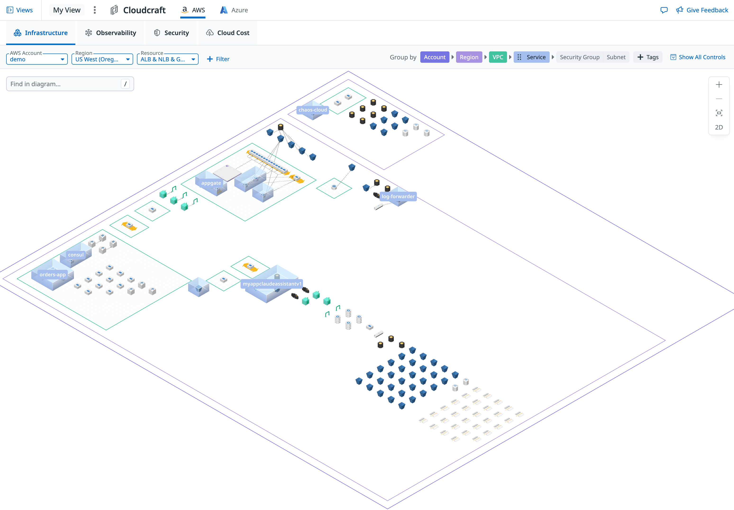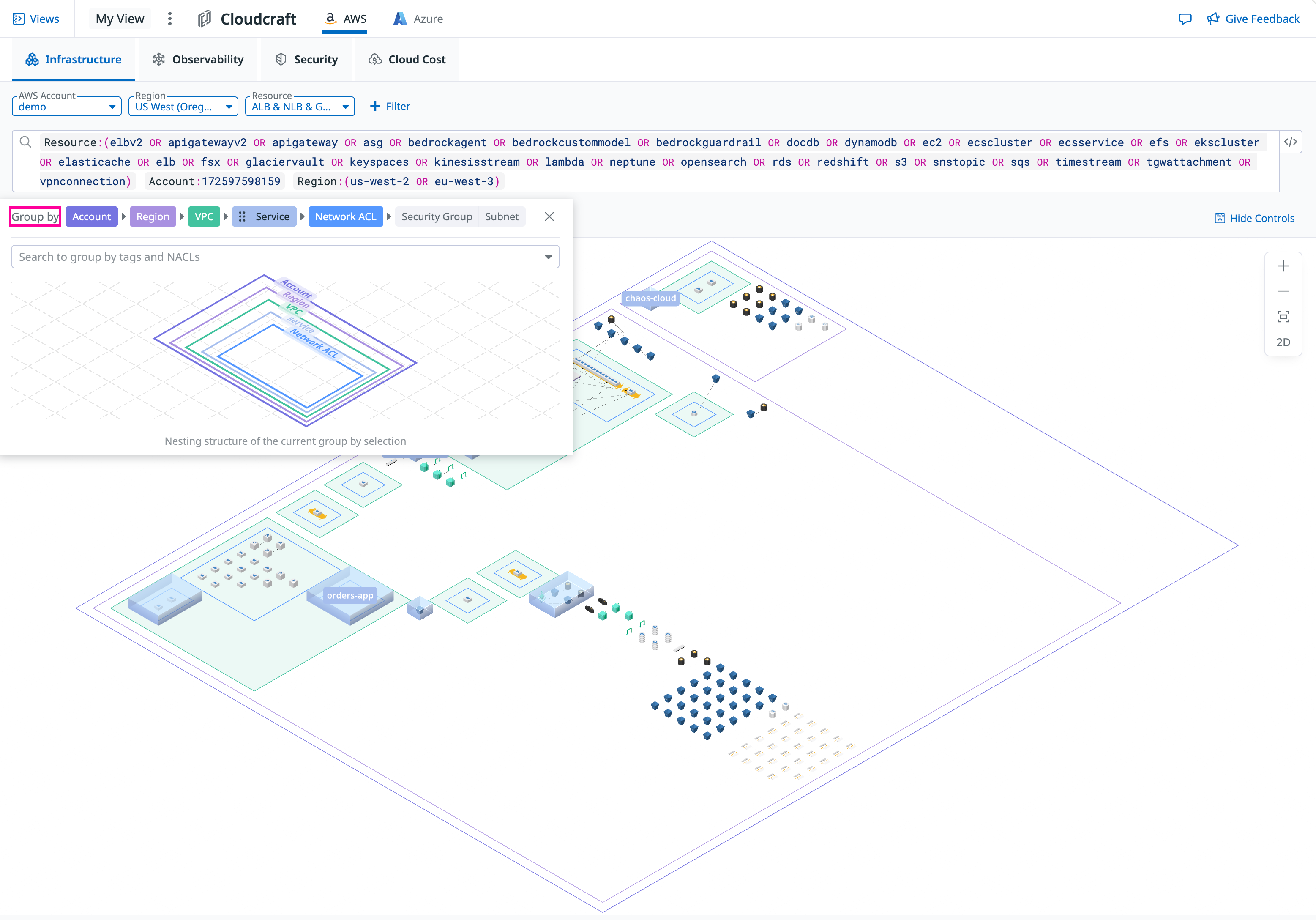 You can group resources by AWS and Azure tags, such as app, service, team, or cost center, to organize your view by team or workload. When grouping by tags, color-coded labels are displayed on each group. When grouping by the service tag, a raised block is displayed to visually indicate the service grouping.