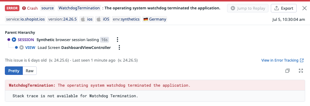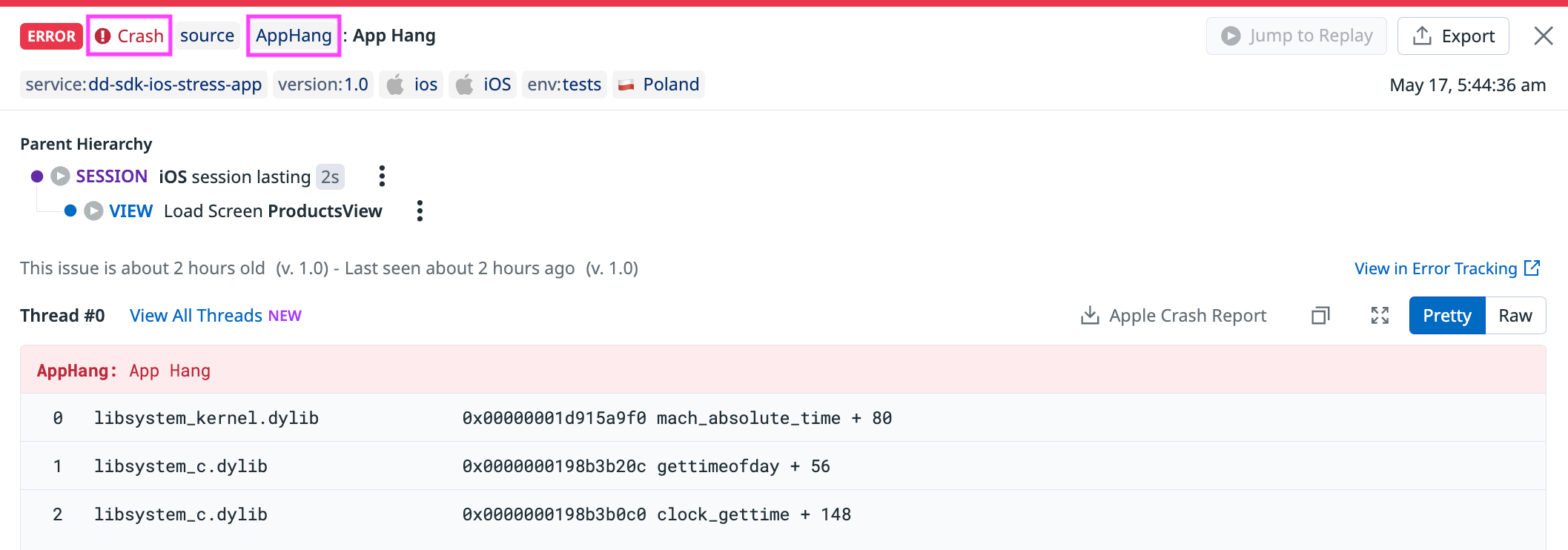 - Non-fatal app hang: How a hang gets reported if the app recovers from a relatively short hang and continues running. Non-fatal app hangs do not have a “Crash” mark on them in Error Tracking and the RUM explorer.