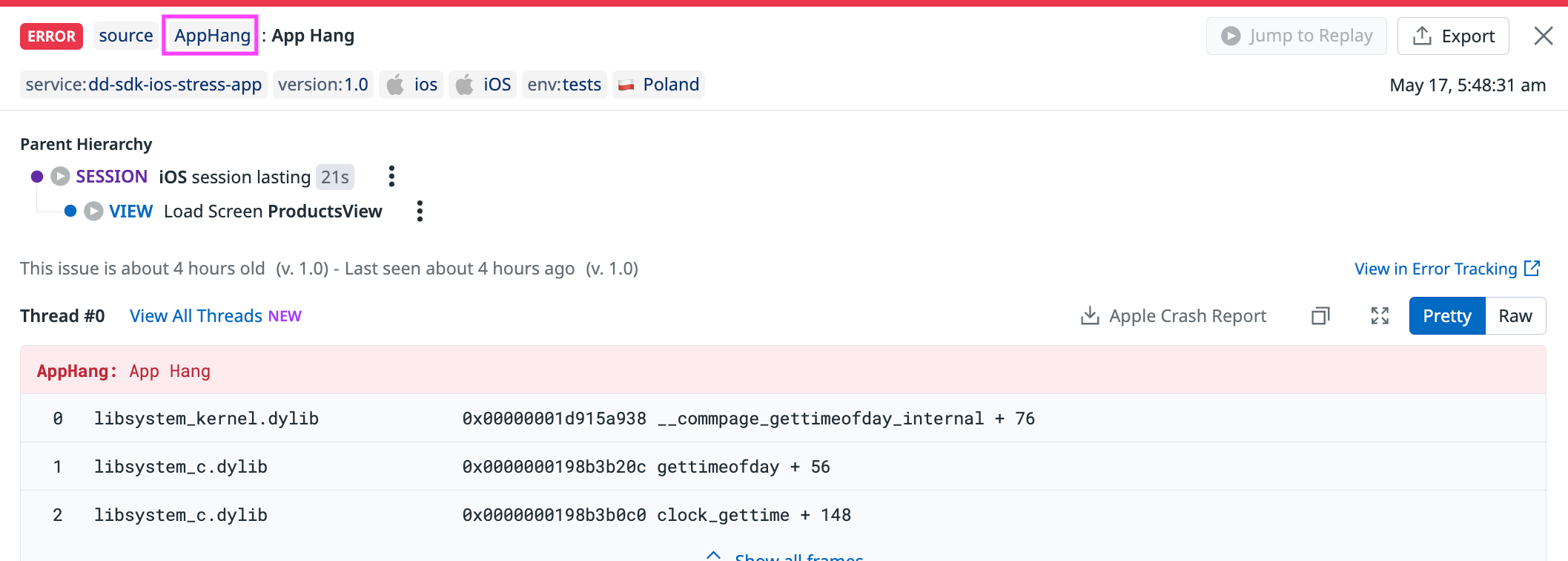 App hangs are an iOS-specific type of error that happens when the application is unresponsive for too long. App hangs are reported through the iOS SDK (not through Logs). By default, app hangs reporting is disabled, but you can enable it and set your own threshold to monitor app hangs that last longer than a duration you can specify in the appHangThreshold initialization parameter. When enabled, any main thread pause that is longer than the specified appHangThreshold is considered a “hang” in Error Tracking. A customizable threshold allows you to find the right balance between fine-grained and noisy observability. See Configure the app hang threshold for more guidance on setting this value.