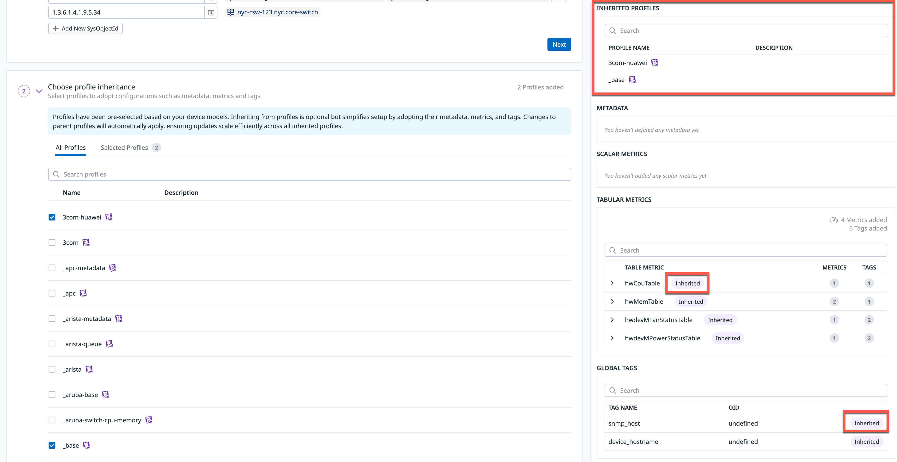 Keep the Datadog _base.yaml profile, and any other inherited Datadog profiles specific to your needs. Optionally, you can select additional profiles to inherit. The relevant fields appear on the right under Inherited Profiles, with an Inherited tag next to any inherited metrics, tags, or metadata: