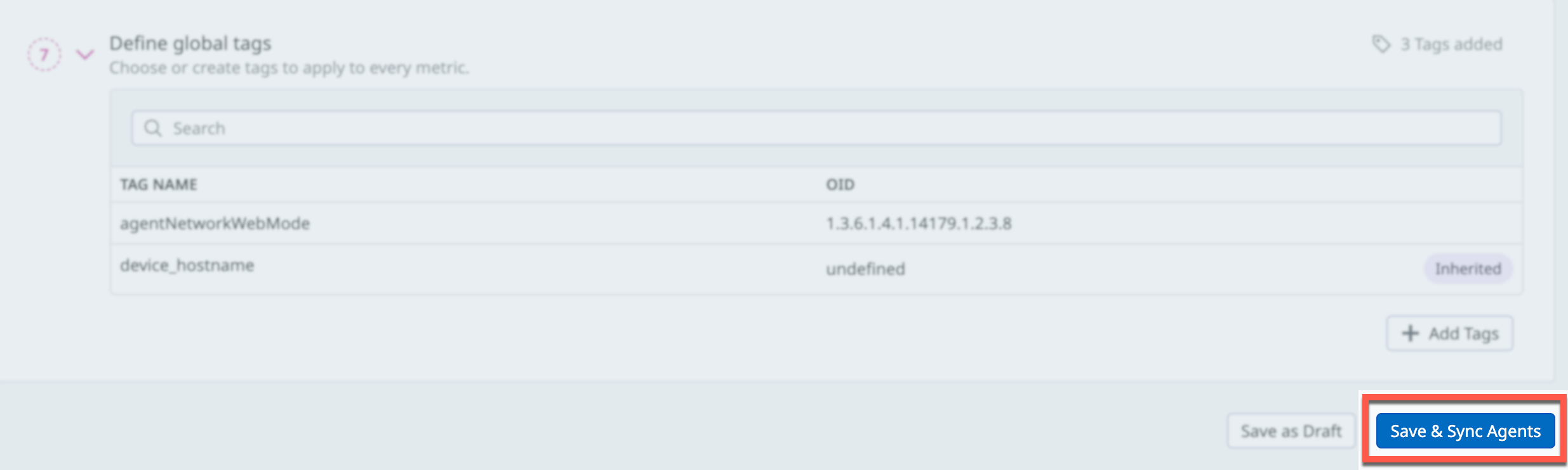 After applying your configuration options to your device profile, click Save and Sync Agents to automatically apply this profile to all NDM agents. The configurations are applied to your devices with Remote Configuration. See prerequisites for more information.