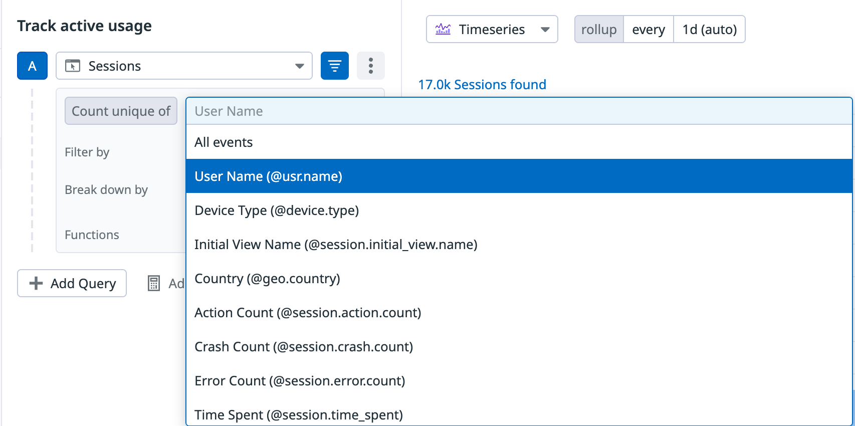 Drop down menu in Product Analytics for choosing a measure to graph the unique count.