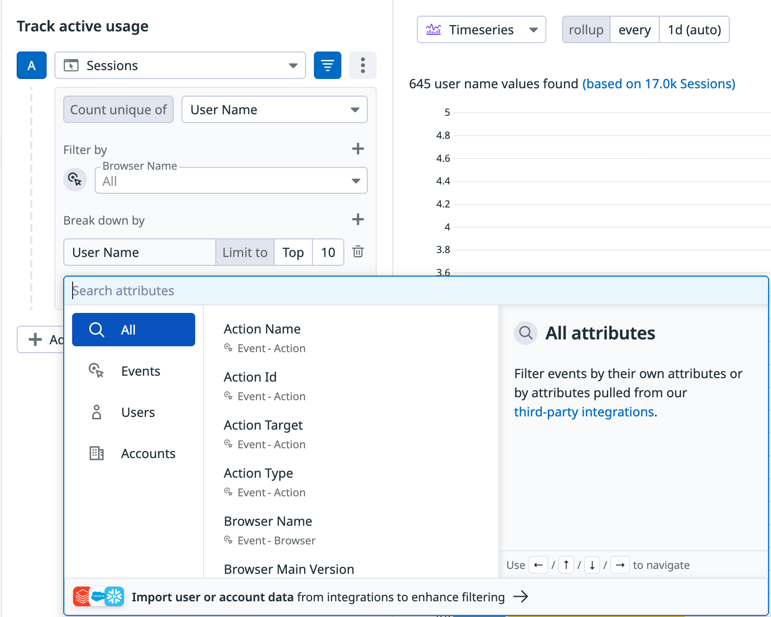 Drop down menu in Product Analytics to further breakdown events by their own attributes or by attributes pulled from third party integrations.