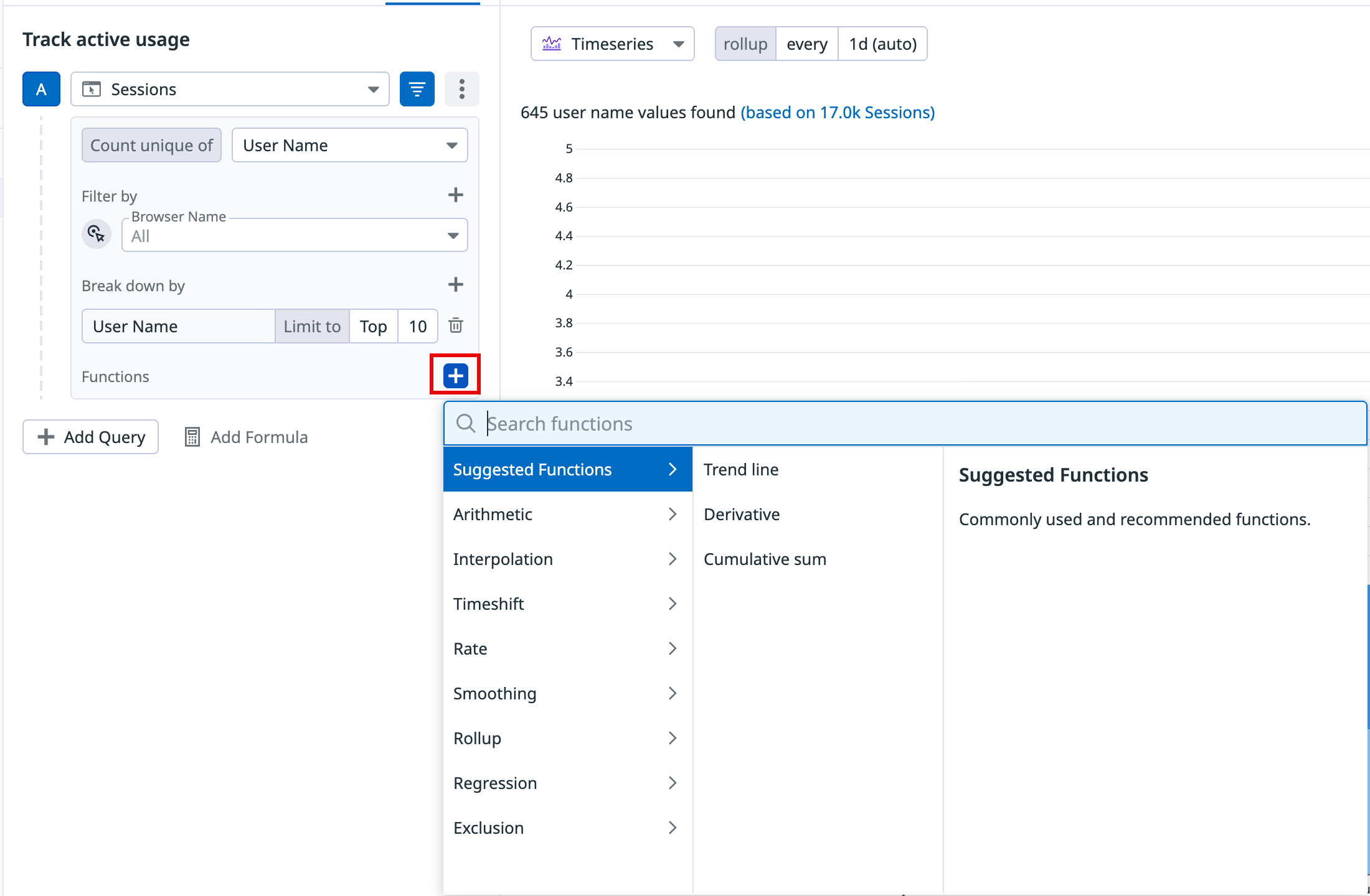 Button in Product Analytics to add a function to modify how the results of a metric query are returned for visualizations..