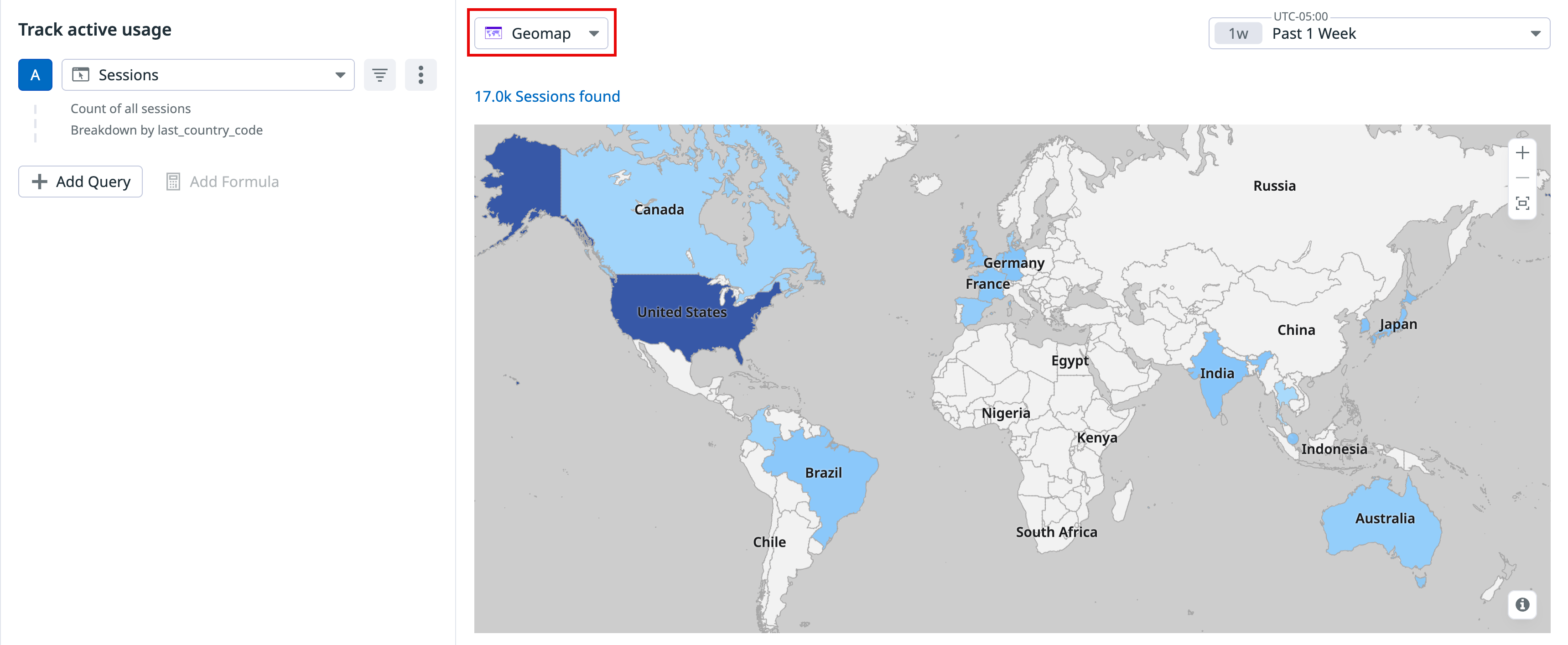 Visualize a single measure (an attribute with a numerical value contained in your Product Analytics events), or a facet (unique count of values) on the world map.