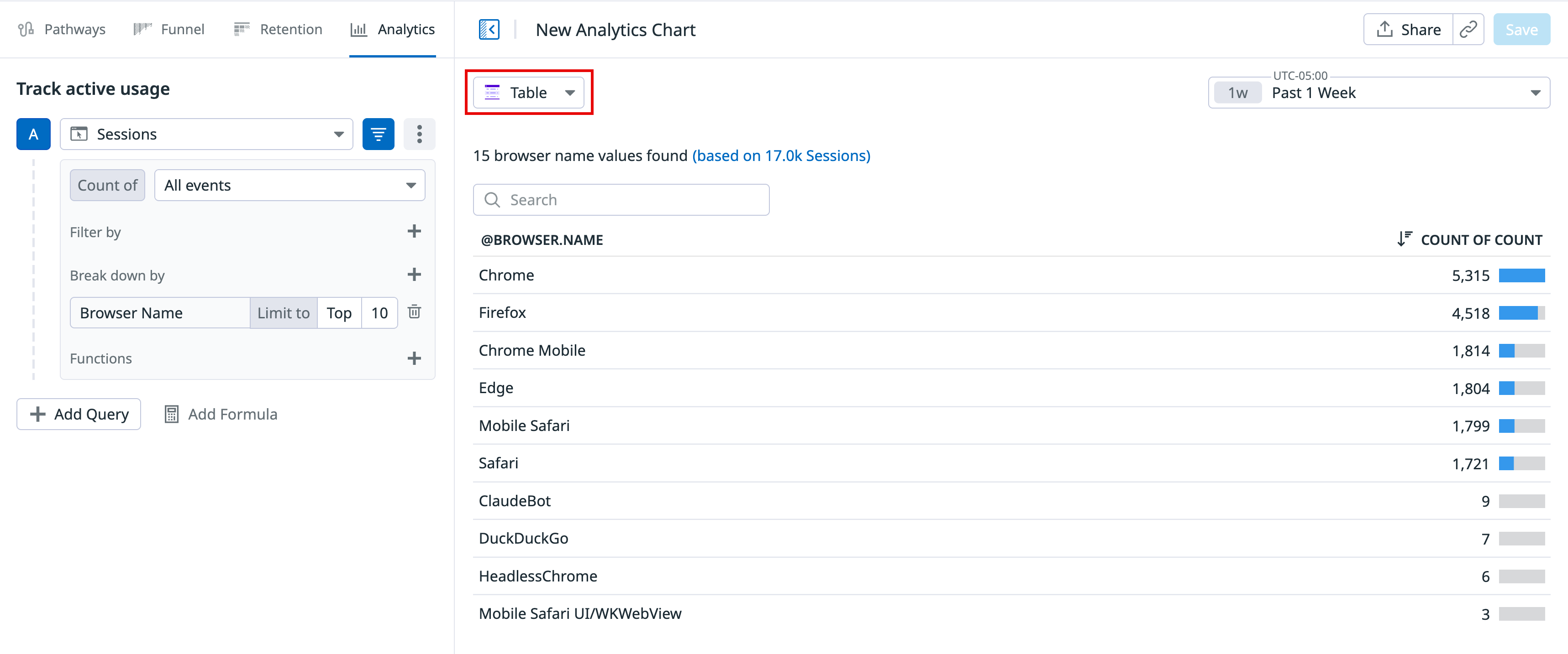 Visualizations define the outcomes of the filters and aggregates displayed in the Analytics Explorer. Select the relevant visualization type to surface the information you need under the search query.