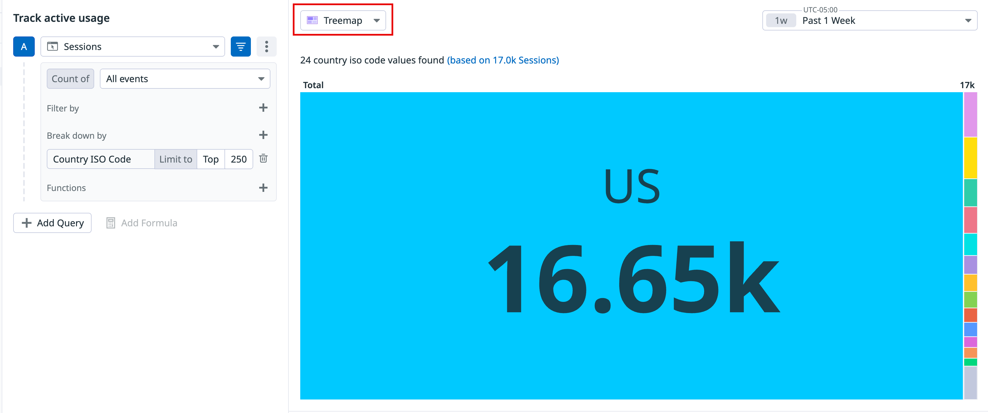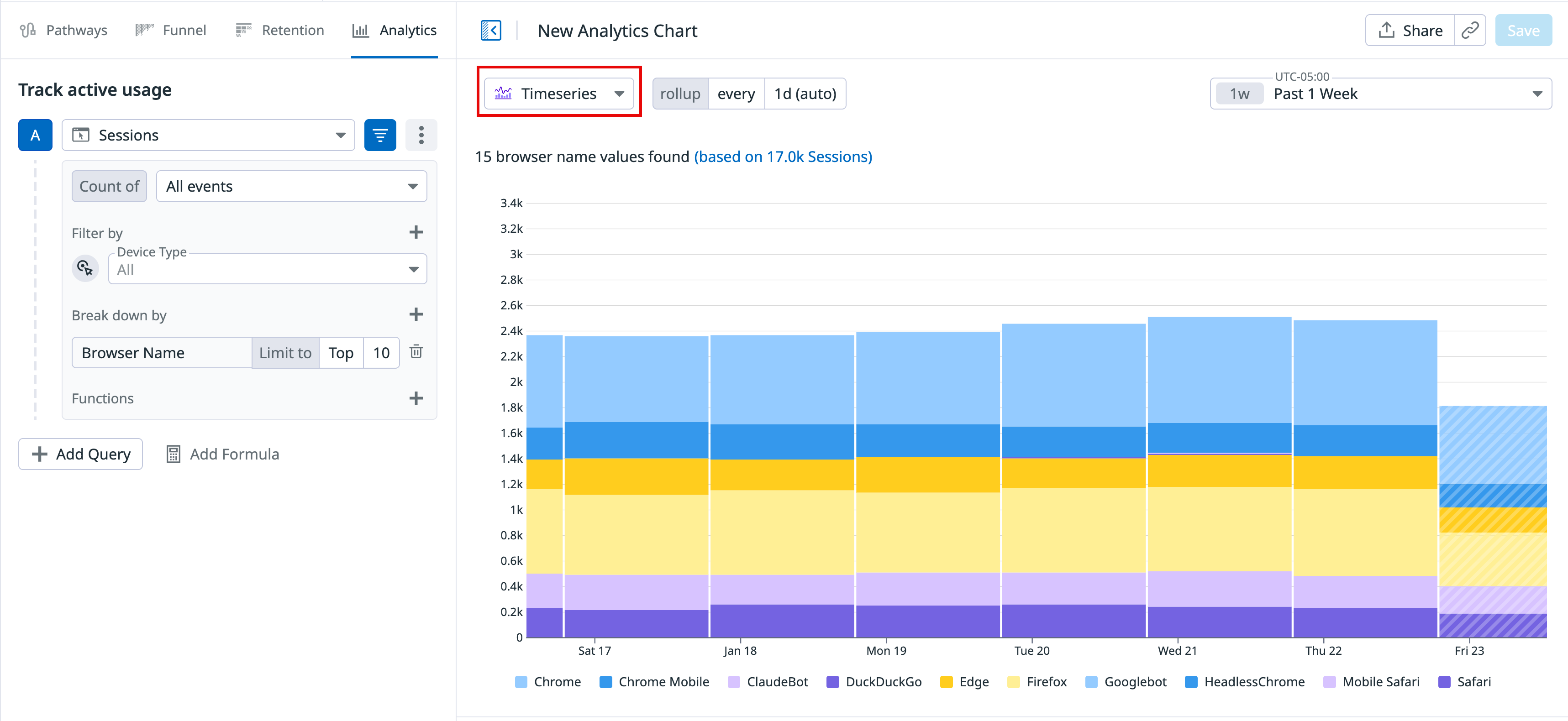 - Display: Results are shown as bars (recommended for counts and unique counts), lines (recommended for statistical aggregations), areas, and several color sets are available.