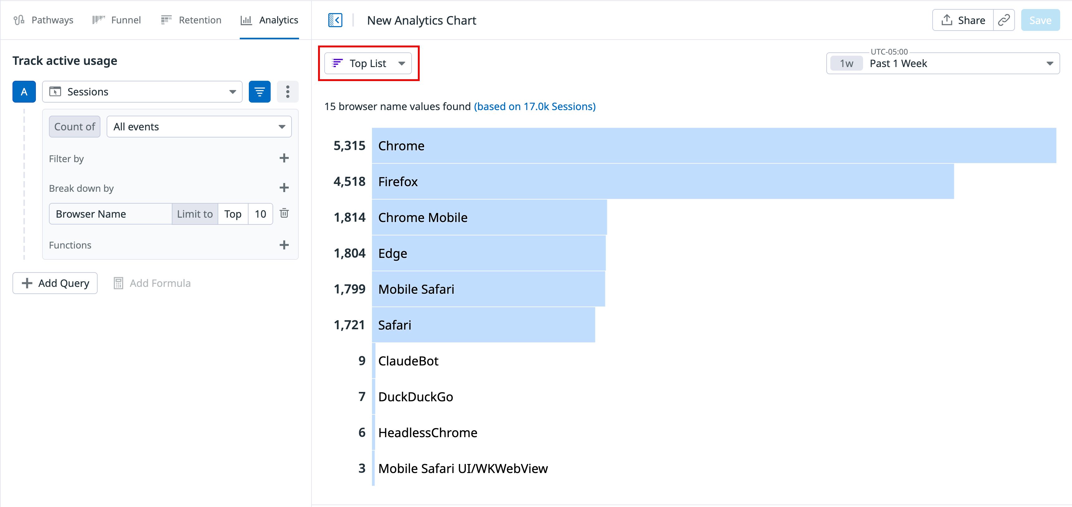 For funnel graphs, click on the graph to see a list of converted and dropped off sessions that correspond to your queries.