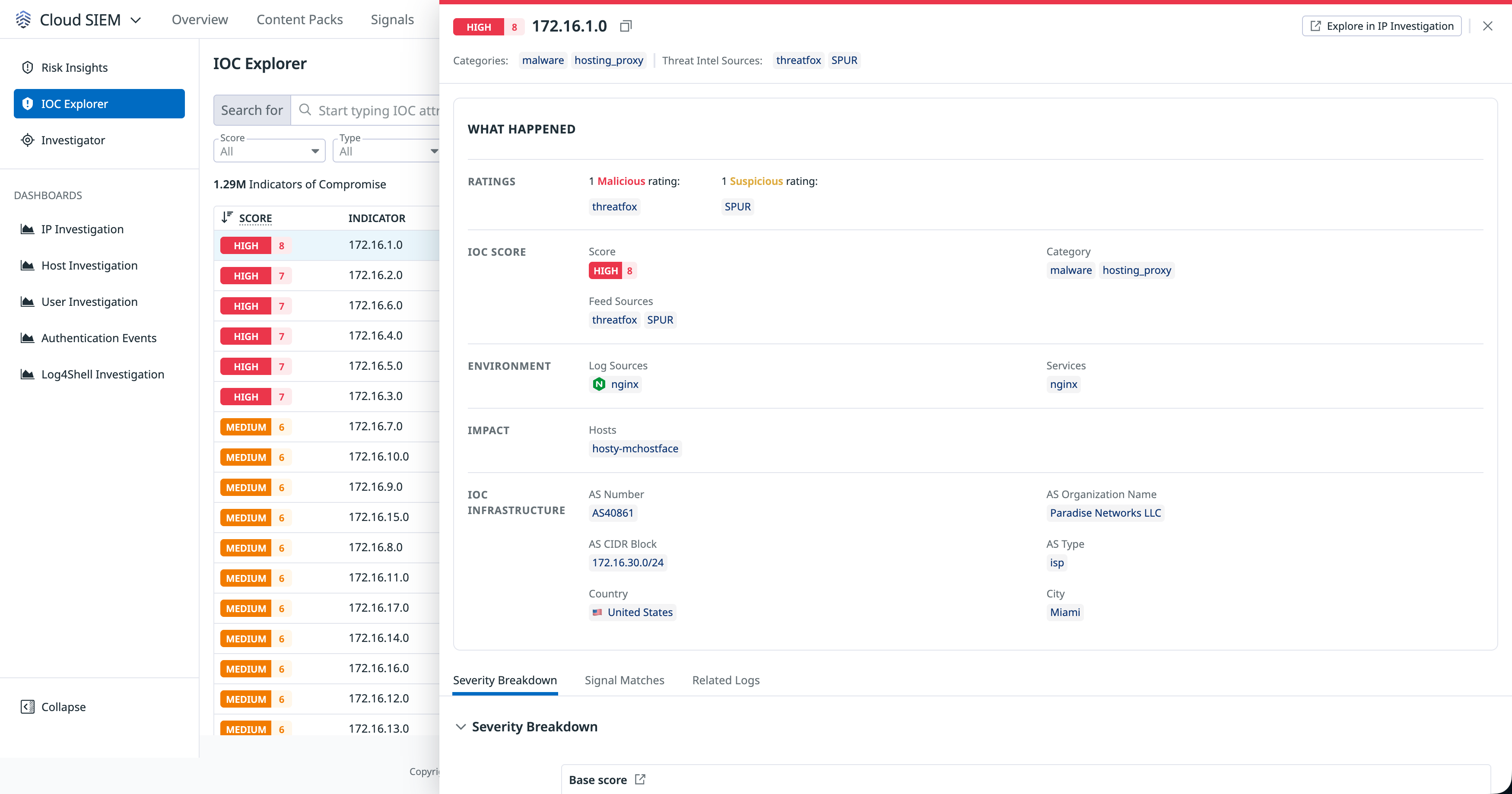 Indicators of Compromise (IOC) are evidence that your systems have experienced a security breach. With the IOC Explorer, you can view more details about compromises, and see related signals and logs.