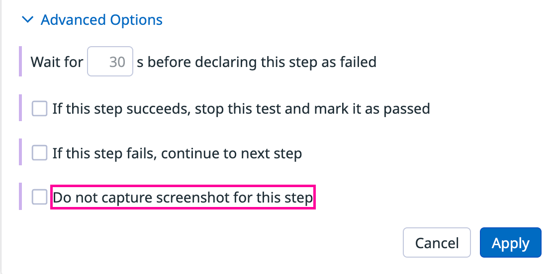 Screenshots can be disabled by checking “Do not capture screenshot for this step” in the Advanced Options section.
