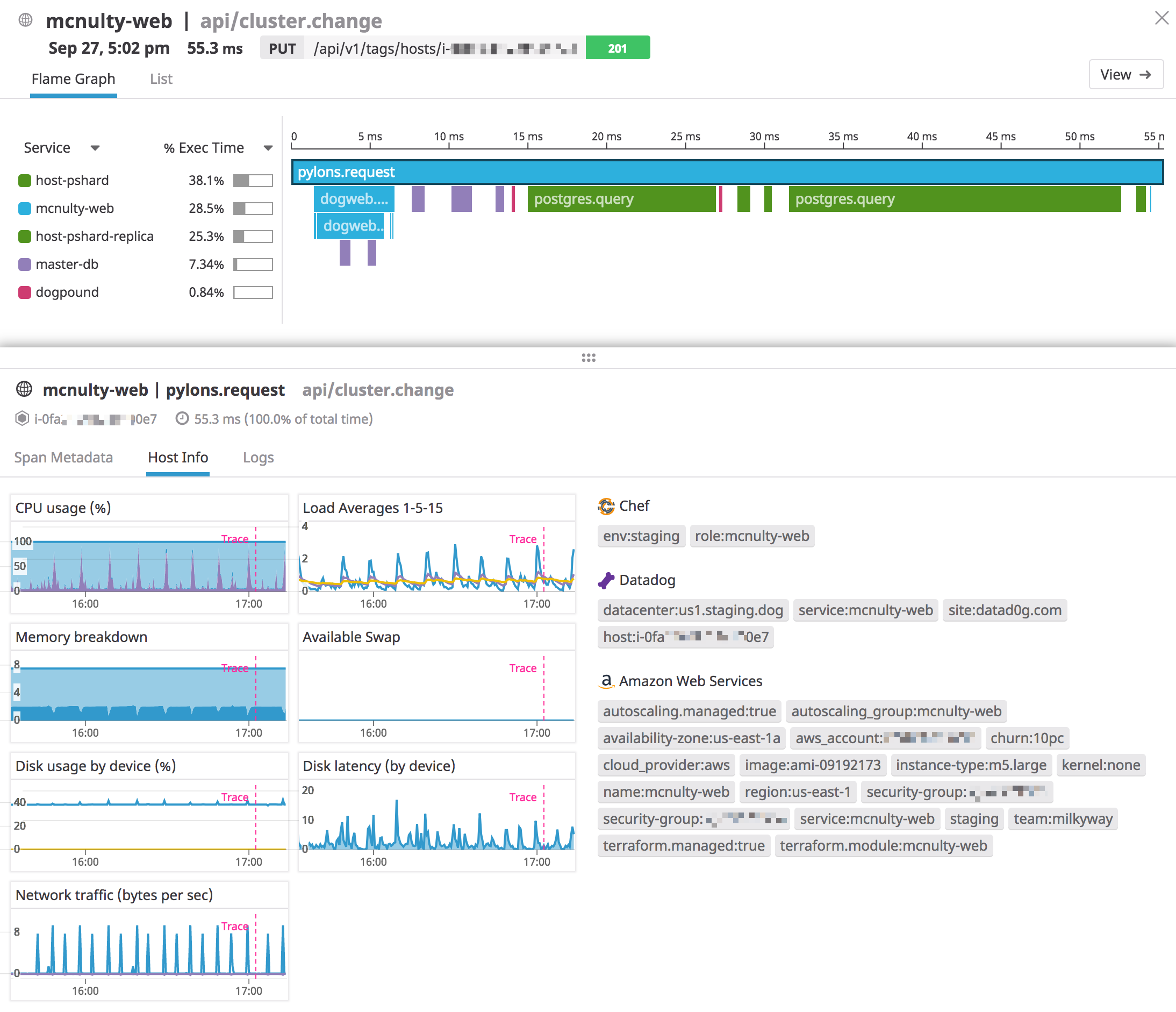- Color coding: Spans are color-coded by service (default), host, or container. To change how spans are color-coded, use the Color by dropdown.