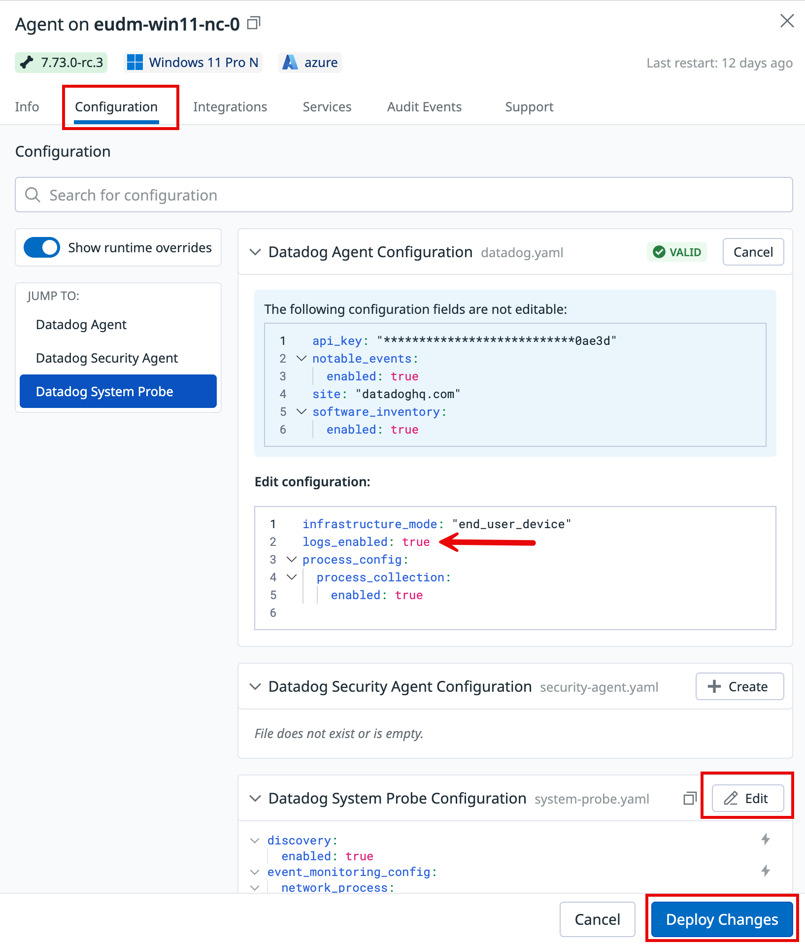 In the following example, the logs_enabled field is changed from false to true. After the changes are deployed, log collection on this Agent is enabled.
