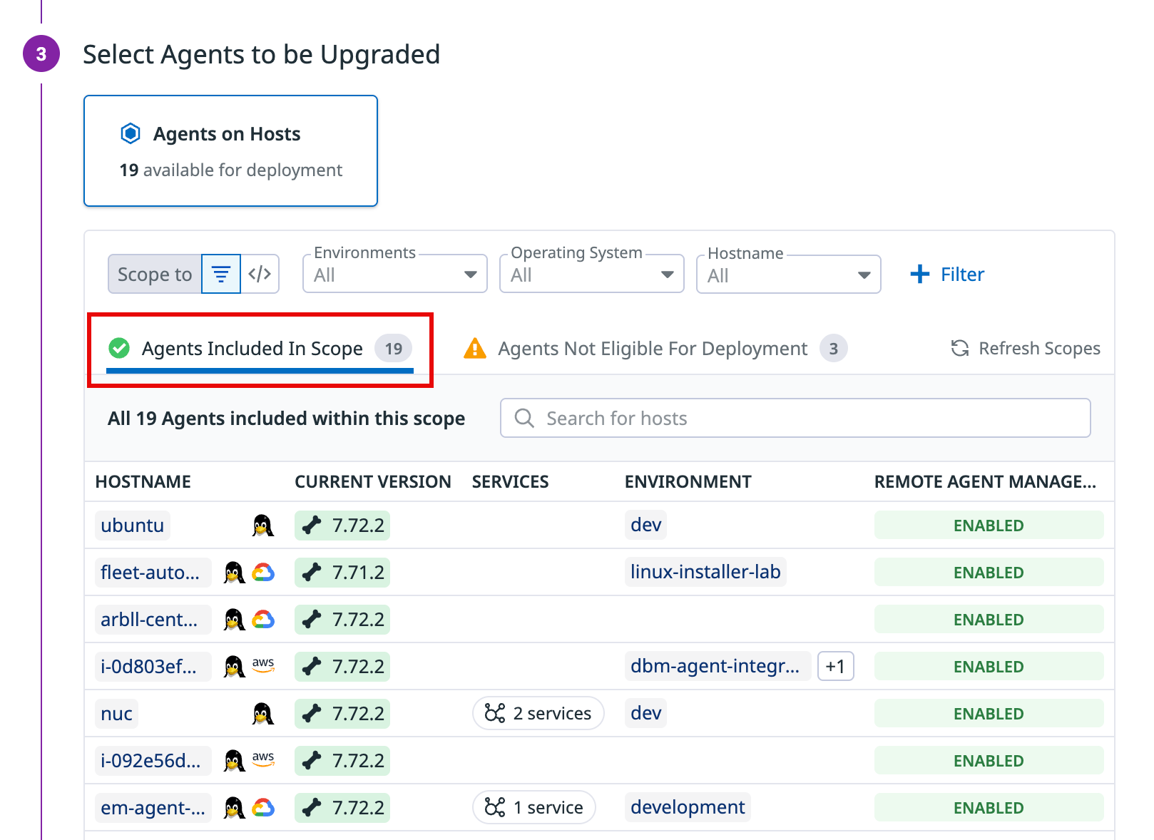 Select the Agents you want to upgrade. You can target a group of Agents by filtering on host information or tags.