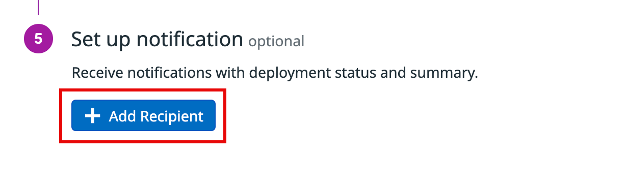 Set up notifications to receive updates on the status of the deployment. You can notify your team of the deployment status through the services you’ve already connected with Datadog, like Slack, Teams, or PagerDuty.