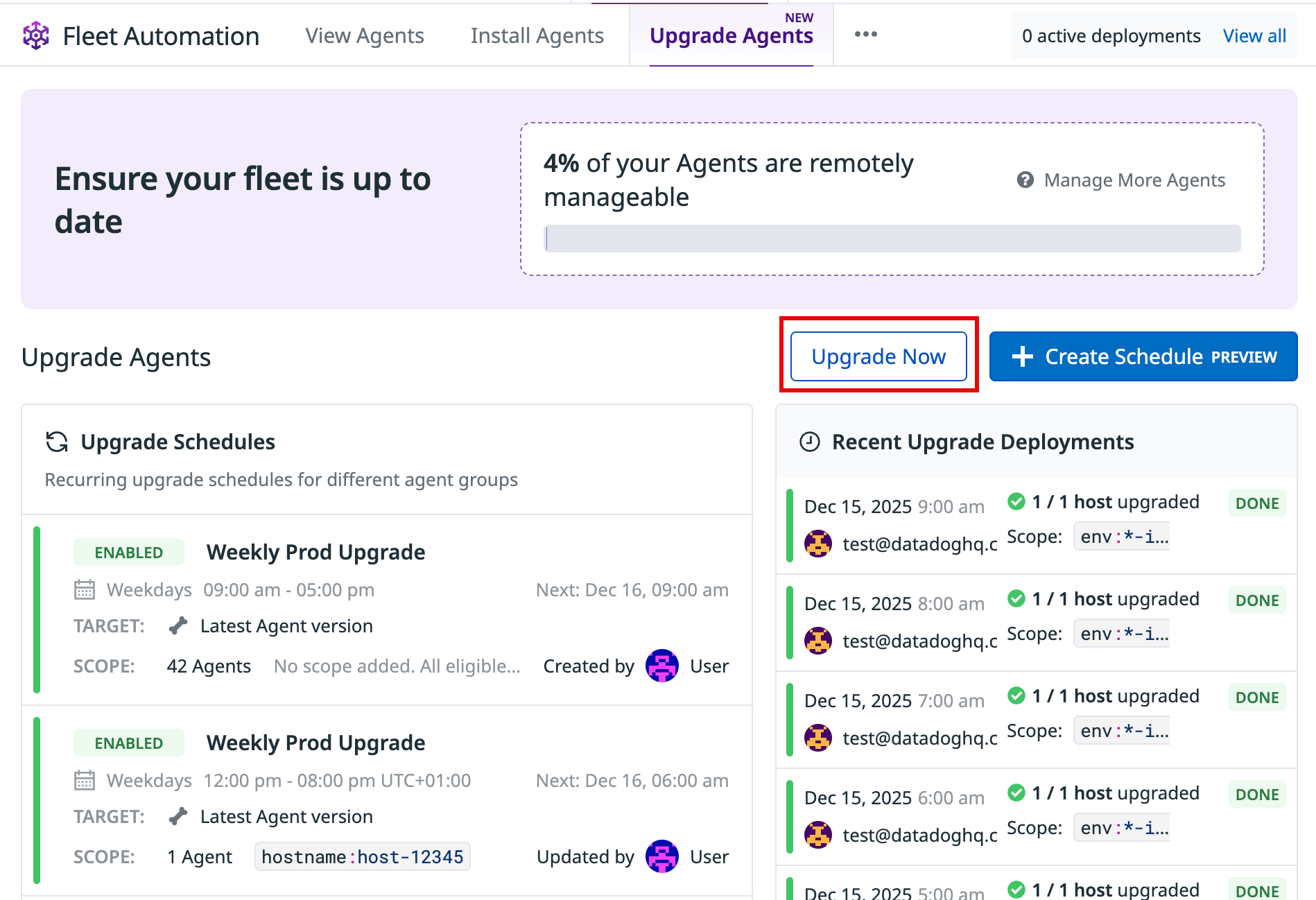 Fleet Automation provides an API to trigger Agent upgrades programmatically or on a recurring schedule. Start upgrades for any set of hosts using filter queries, or create schedules that run during defined maintenance windows with a specified Agent version. For full details, see the Fleet Automation API.