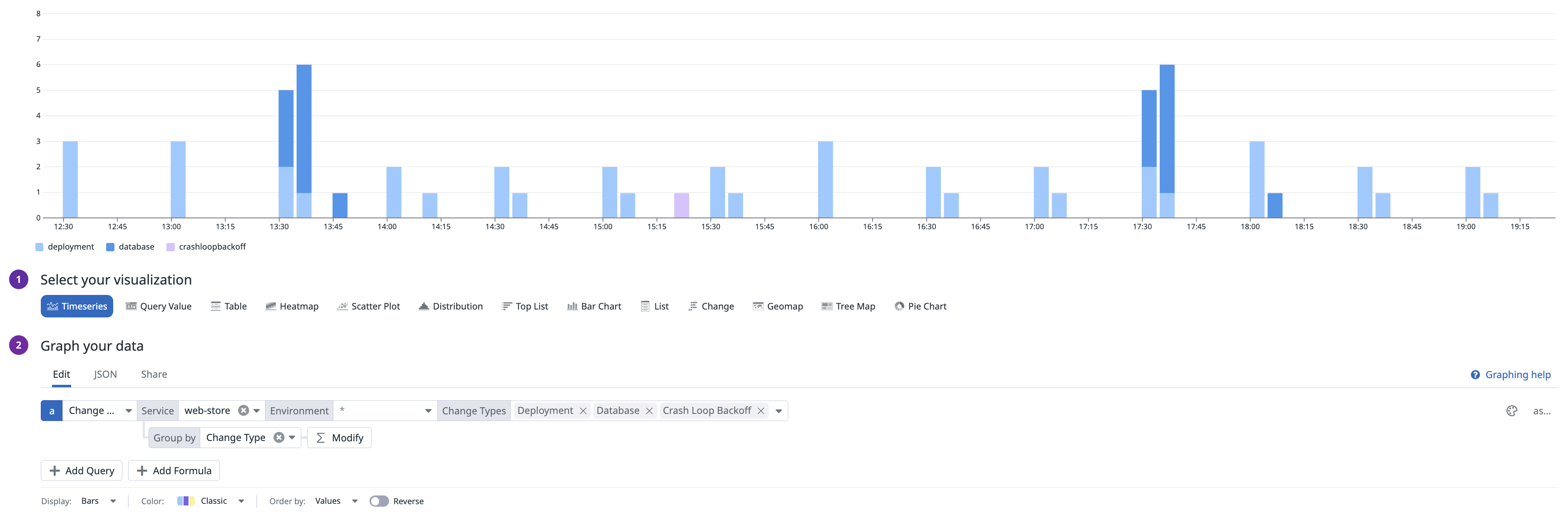 In addition to the out-of-the-box integrations, Change Tracking is available as a data source for widgets across Datadog, including Dashboards and Notebooks.