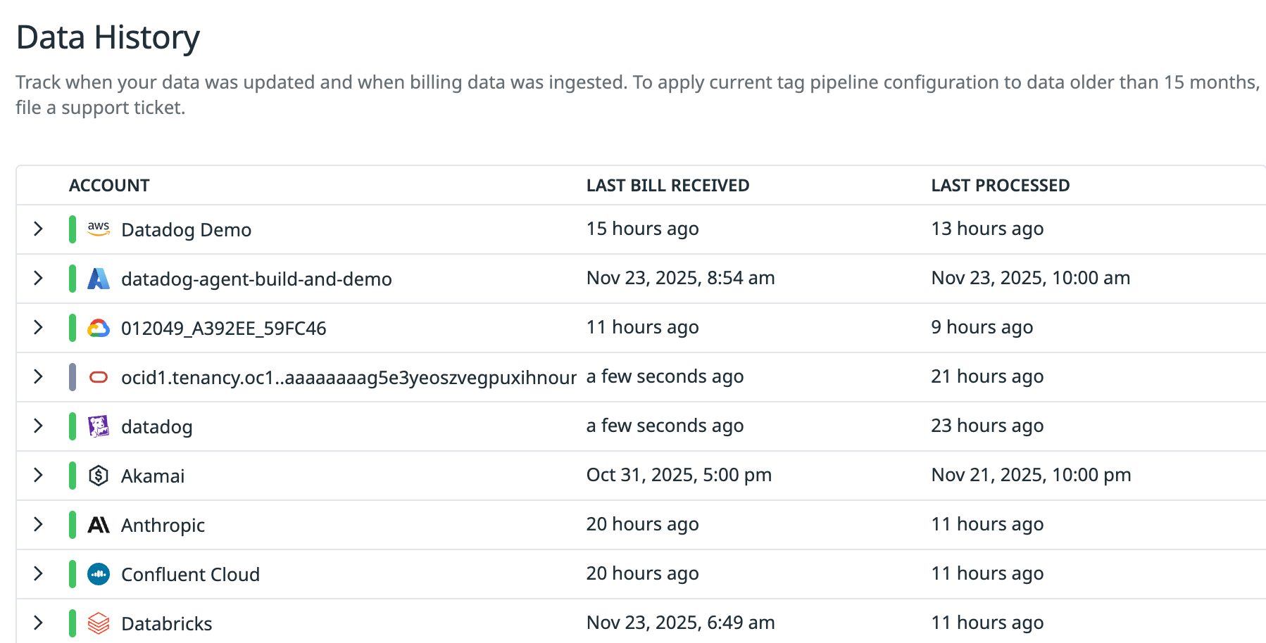 - Last Processed: When Datadog last processed billing data from your cloud provider, including: