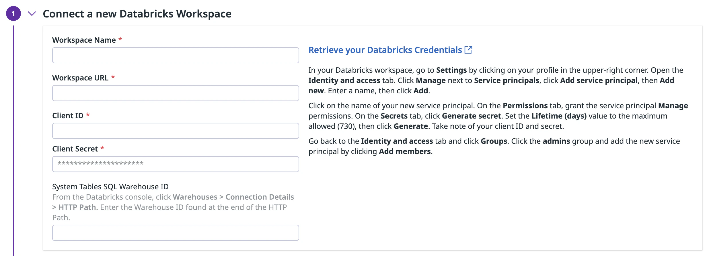 Enter a workspace name, your Databricks workspace URL, and the client ID and secret you generated.