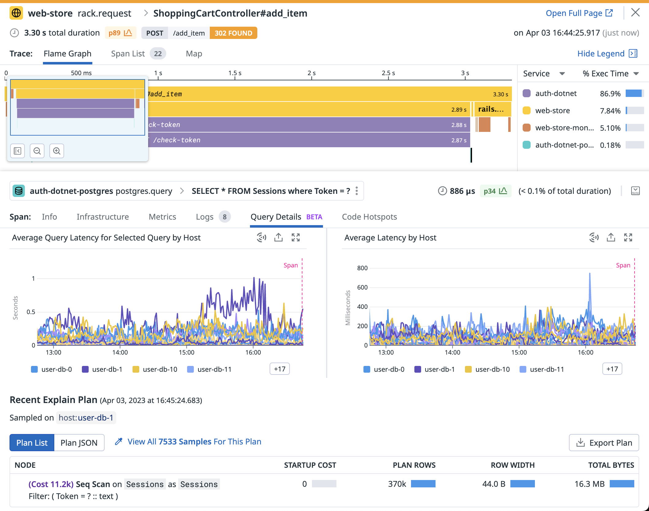 샘플된 대기 이벤트, 평균 대기 시간, 최근 캡처된 실행 계획 등 트레이스에서 실행된 쿼리와 유사한 쿼리의 성능 내역을 확인하여 향후 쿼리 성능을 컨텍스트 속에서 파악할 수 있습니다. 비정상적인 동작이 있는지 확인한 후 데이터베이스 모니터링으로 이동해 데이트베이스 호스트와 관련한 추가 컨텍스트를 더 자세히 조사할 수 있습니다.