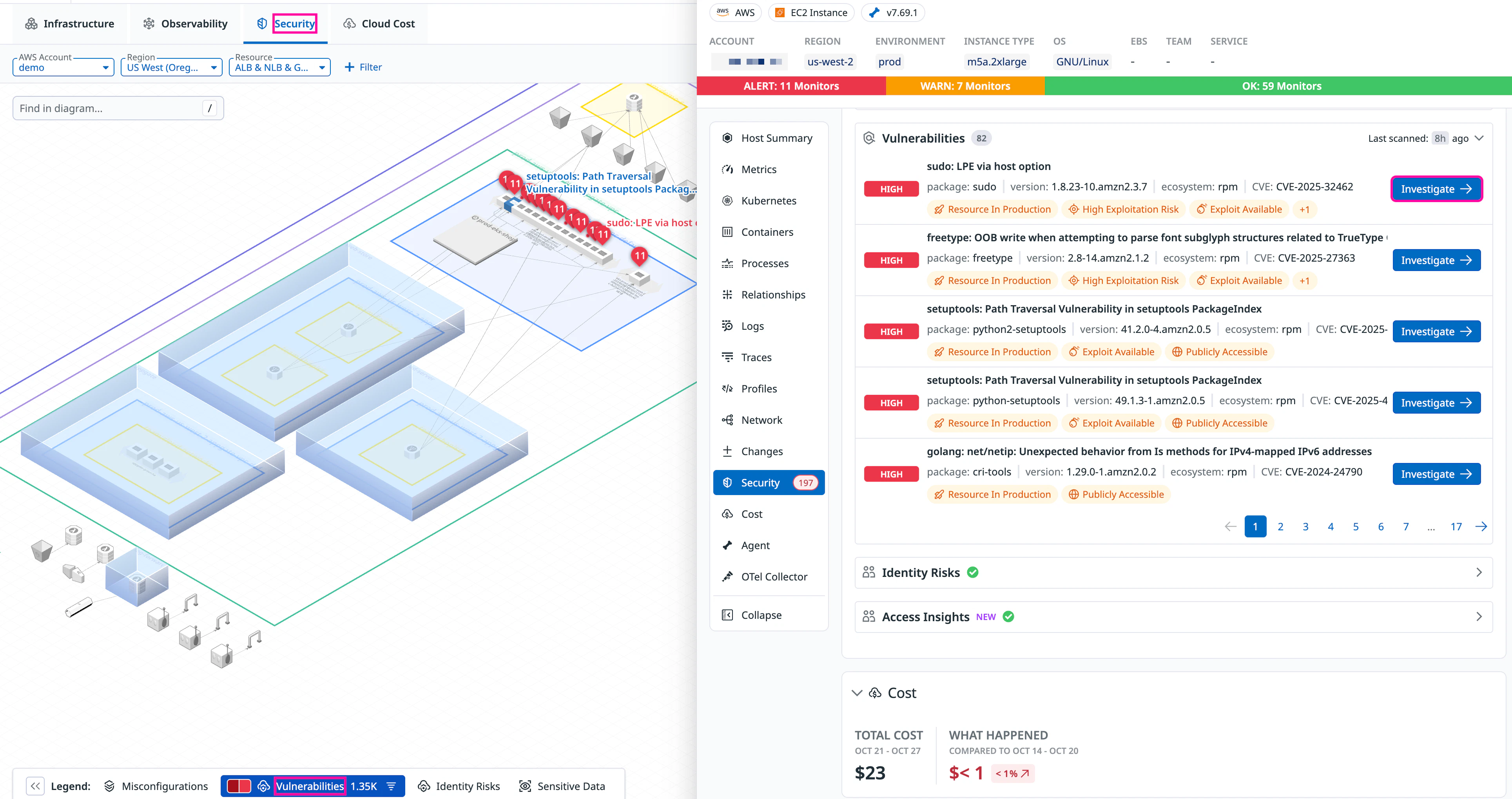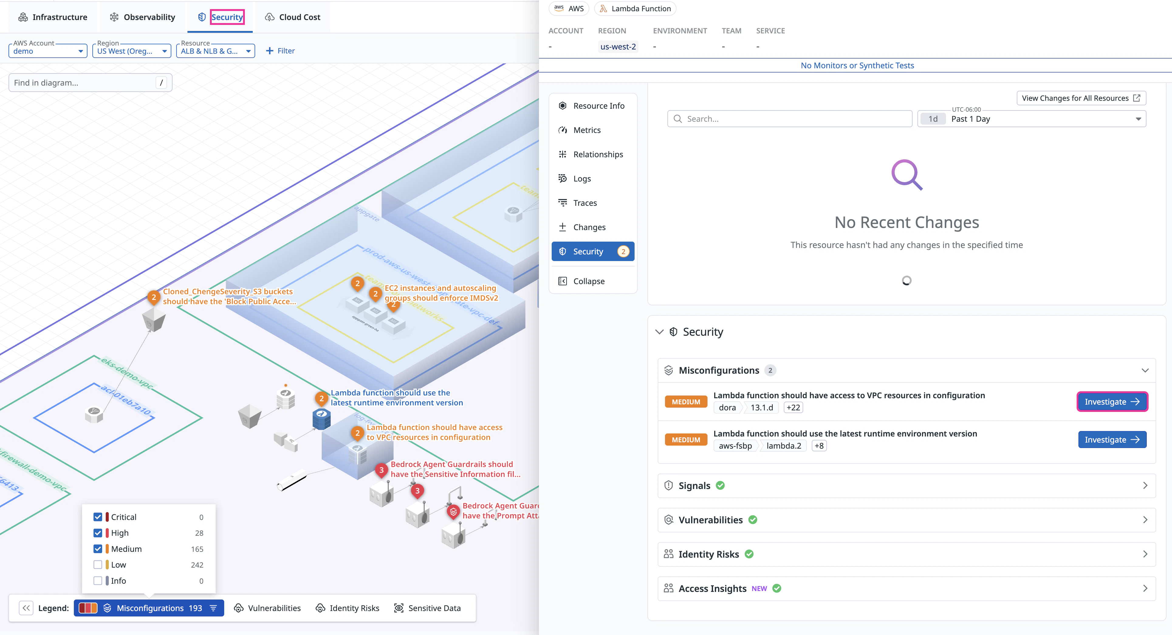 You can click on any resource that has findings to open a side panel with more details, allowing deeper investigation without leaving the diagram. Click Investigate to get more context about the finding and learn how to remediate it.