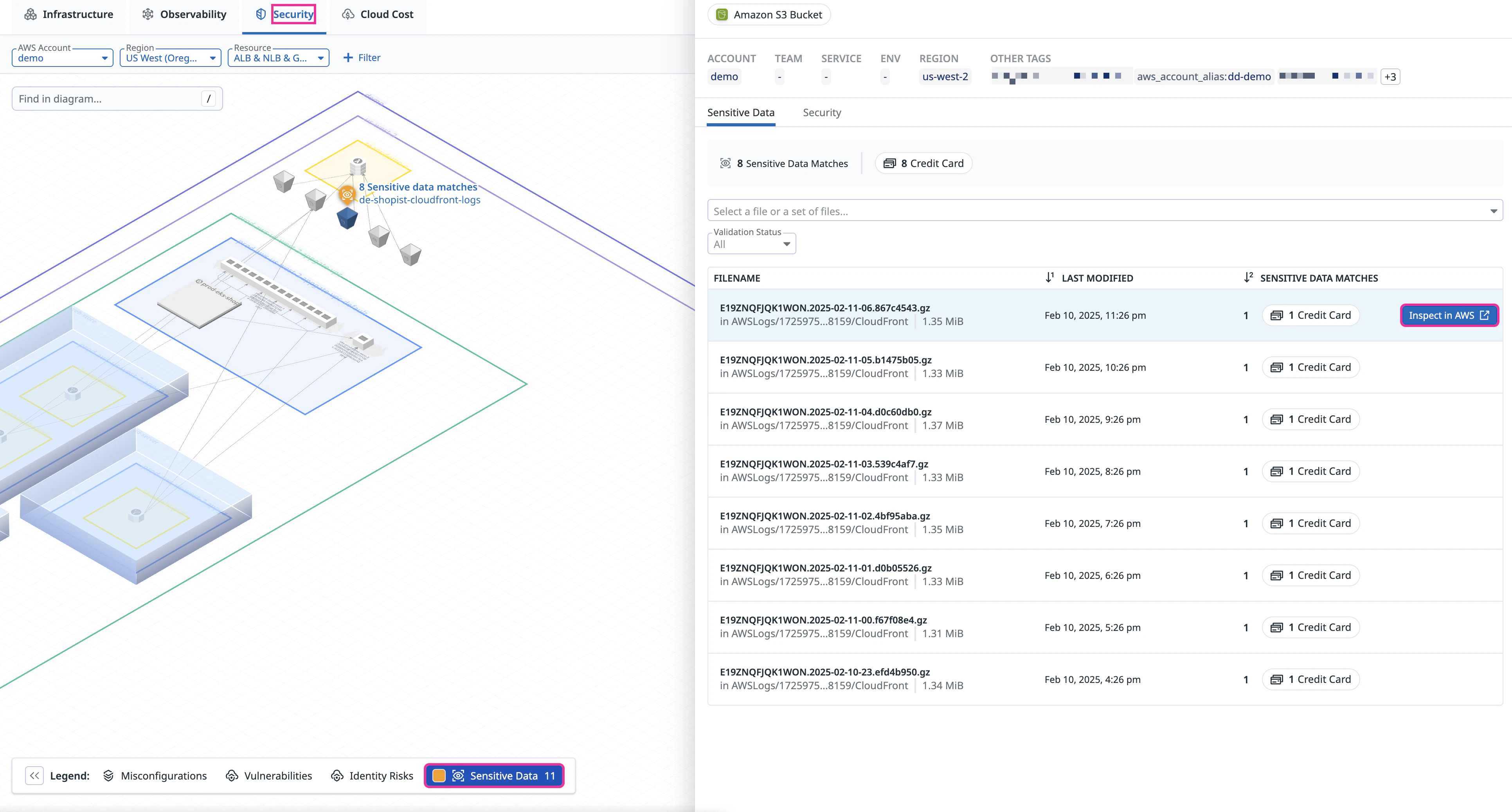 You can view sensitive data matches for your S3 buckets. Click a resource with matches to learn more about the bucket’s sensitive data matches. Then, hover over a filename and click its Inspect in AWS button.