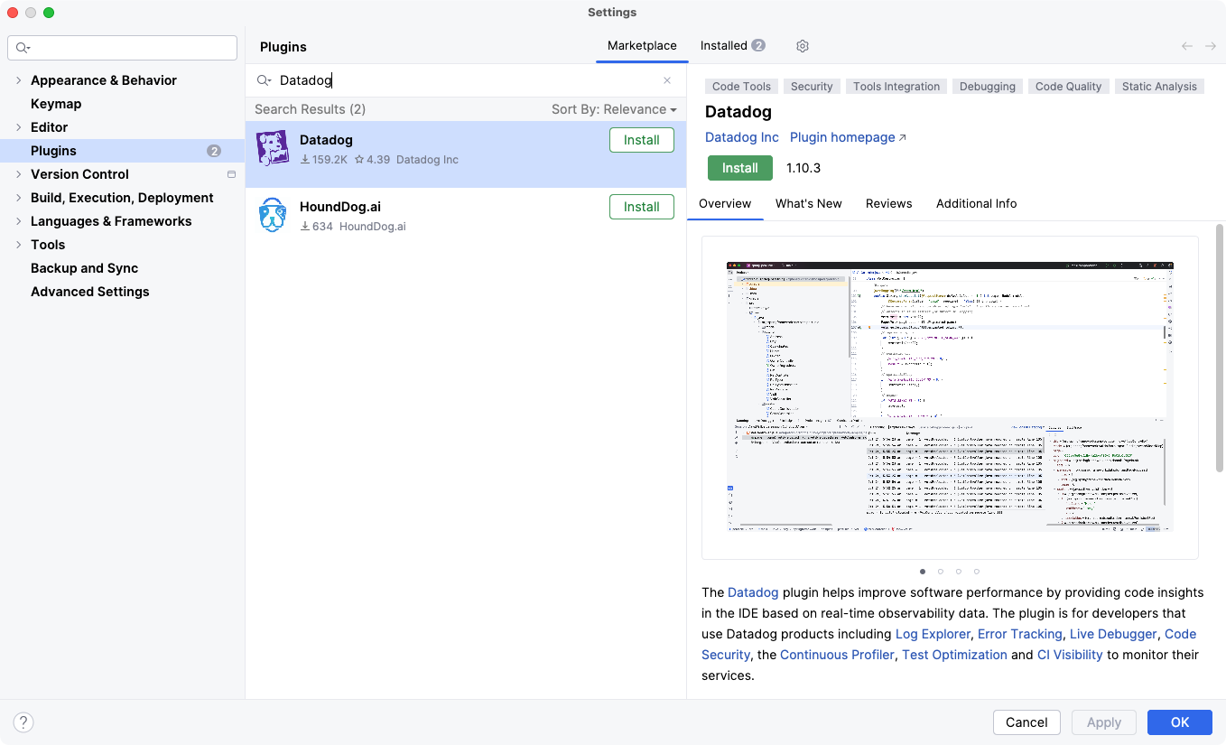 Datadog. - Click Install to download and install the plugin in your IDE.