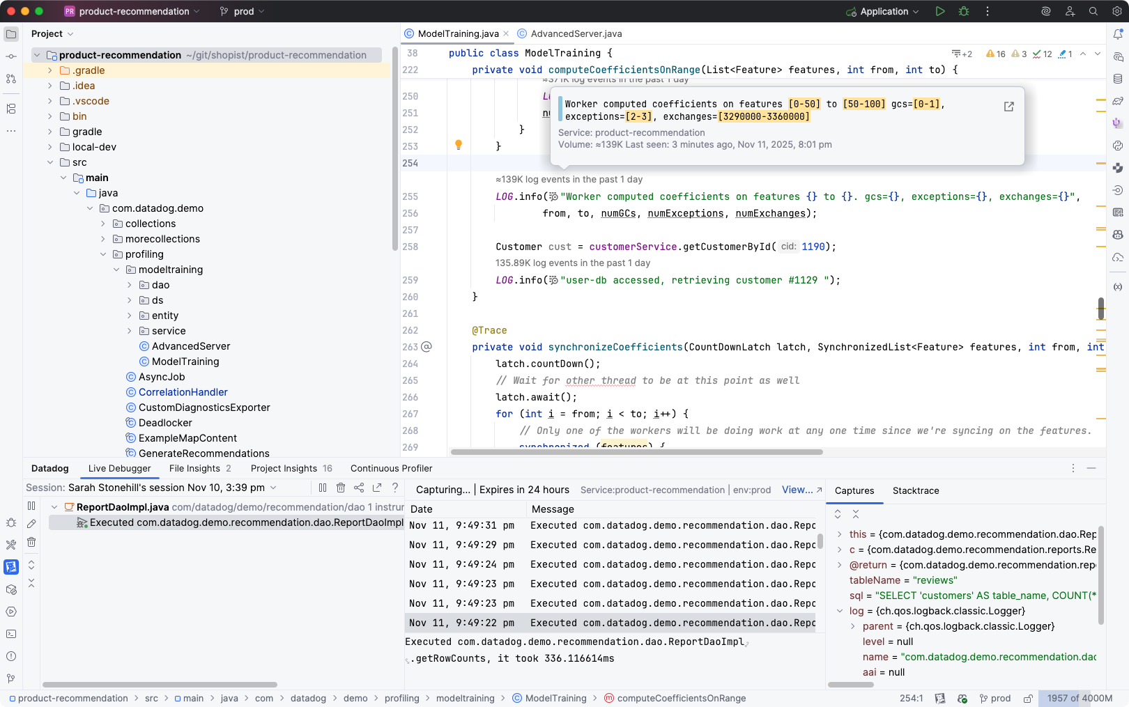 The Logs integration detects log lines in your source code, displays live event counts directly in the source editor, and provides links to the Datadog Log Explorer to view the logs generated by each log line.