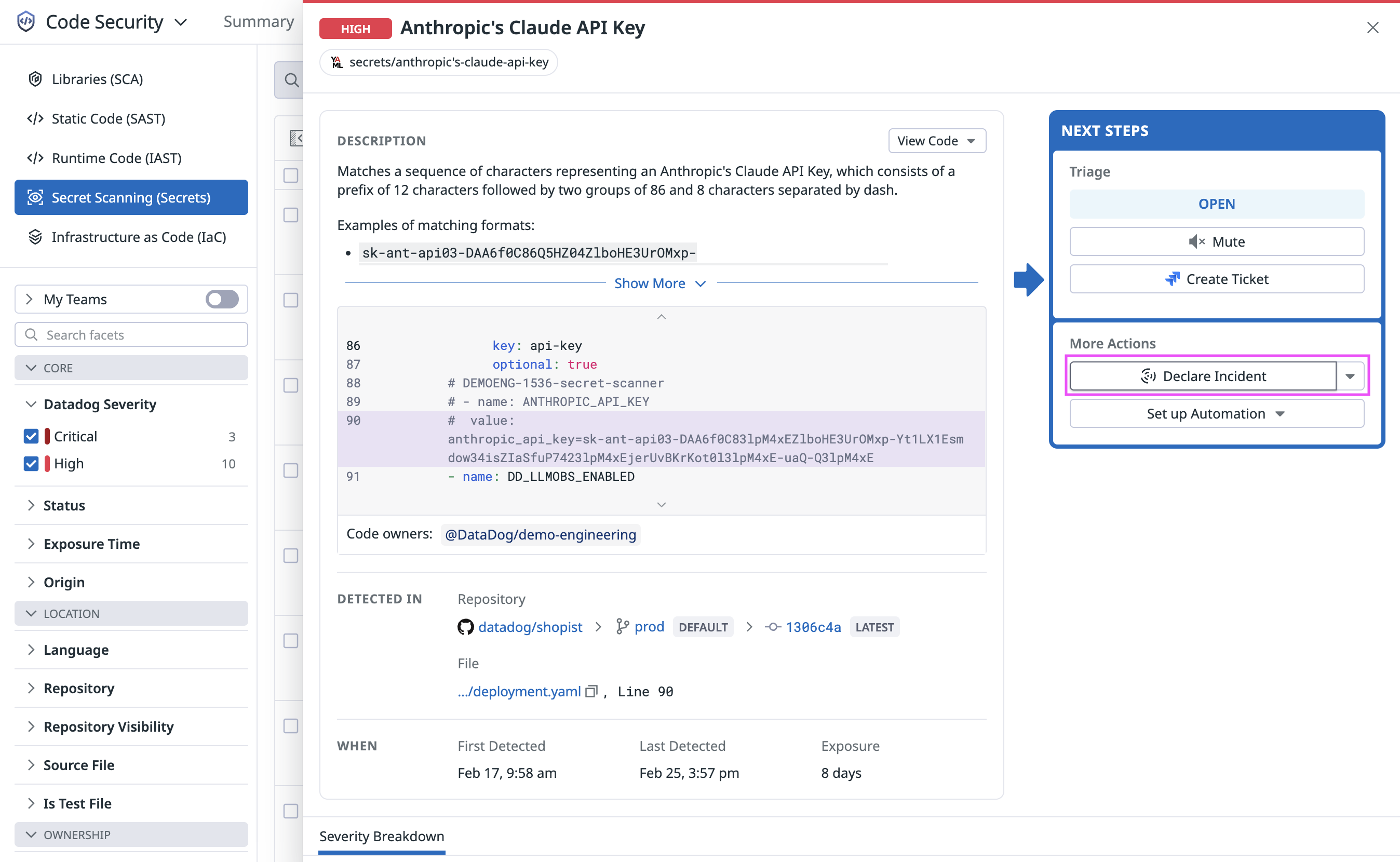 Declare an incident from Secret Scanning by clicking Declare incident in the detection side panel. The incident is pre-filled with all detection metadata.