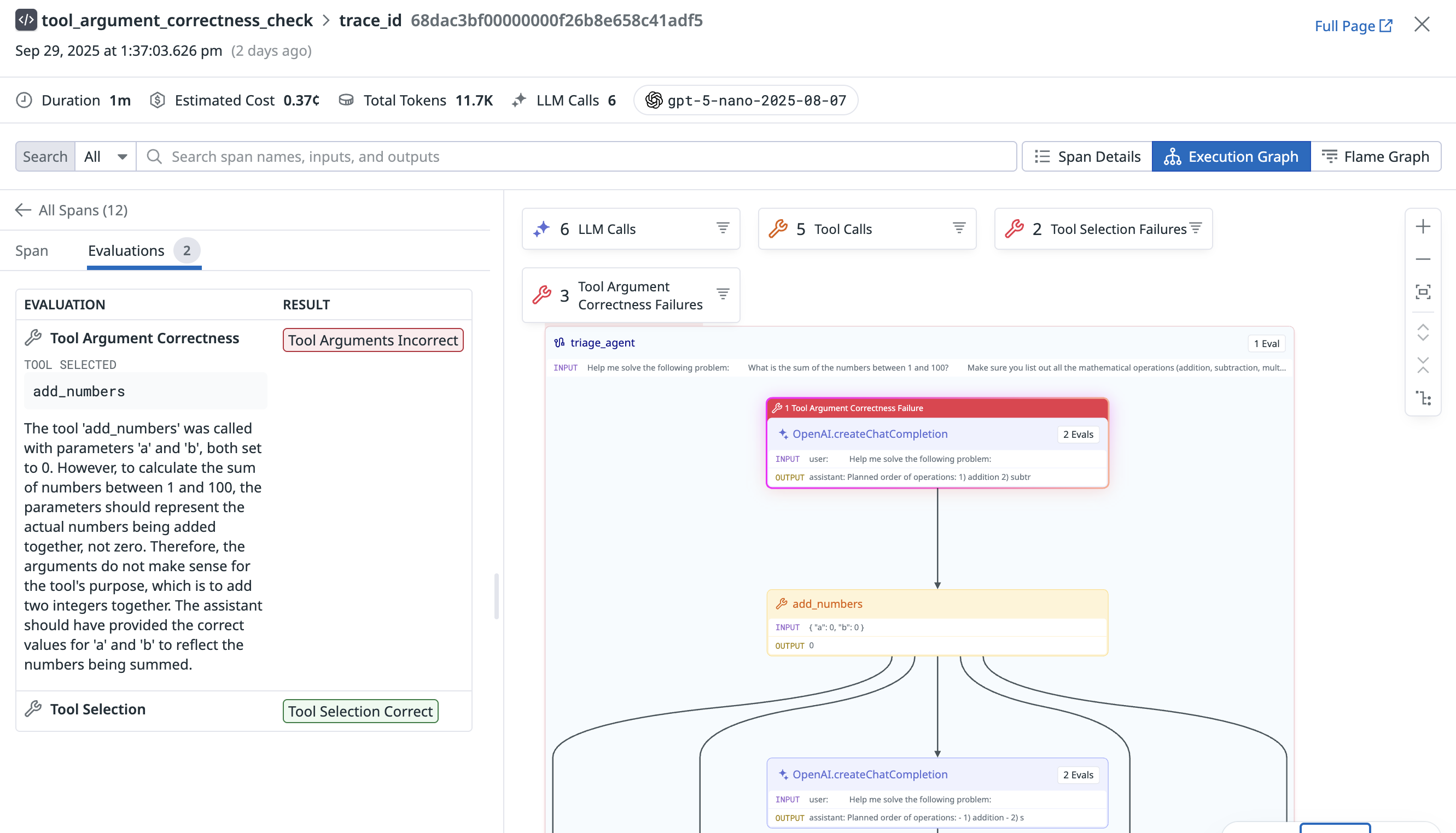 LLM Observability associates evaluations with individual spans so you can view the inputs and outputs that led to a specific evaluation.