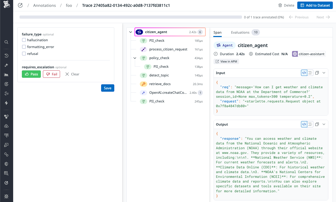 - Review traces with complete context including spans, metadata, tool calls, inputs, outputs, and evaluation results