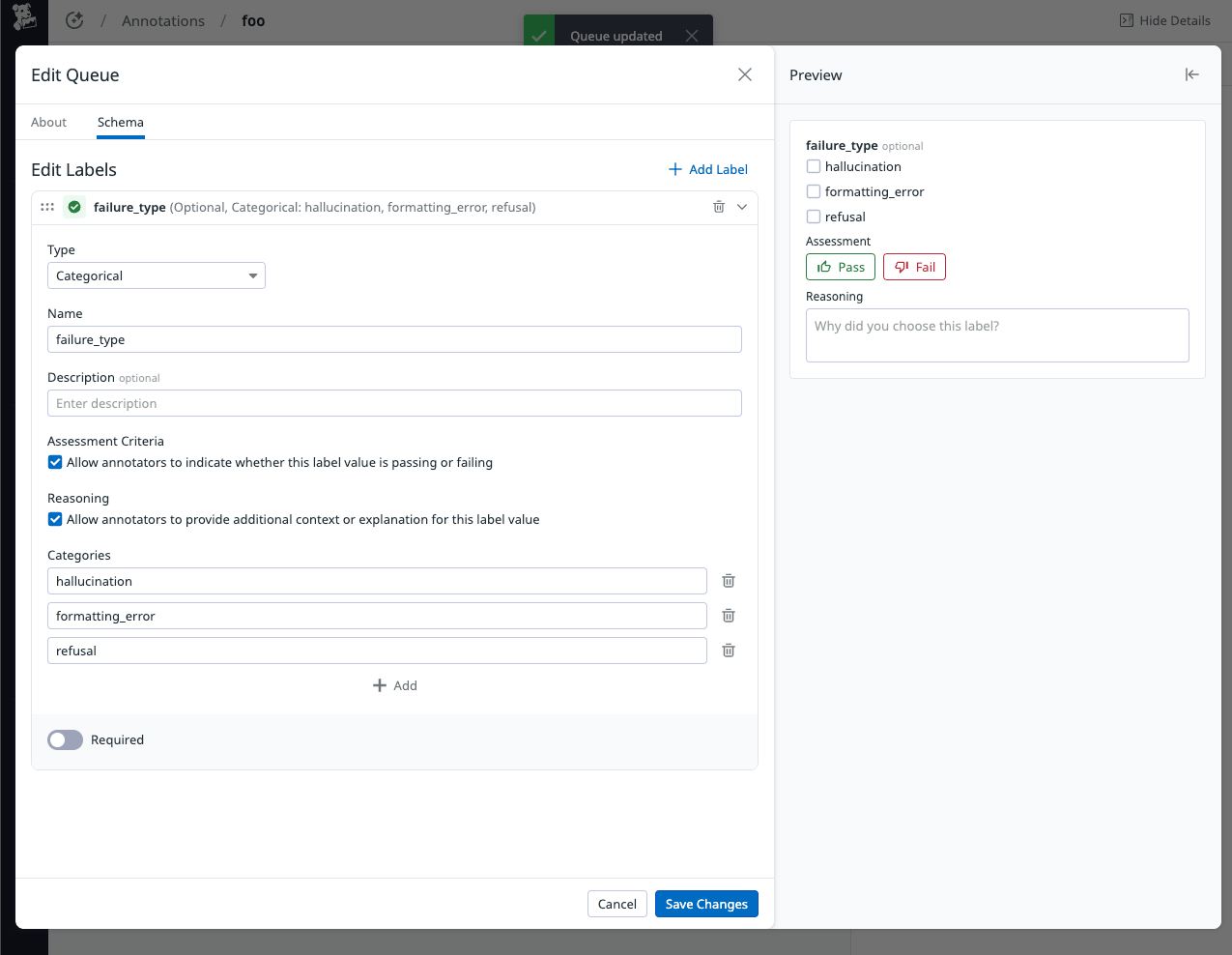On the Schema tab, define your new queue’s label schema. Use the Preview pane to see how labels appear to annotators as you configure them.