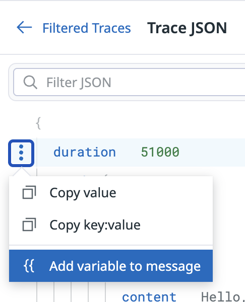 Additional variables are available: type {{ to see the full list. You may also use Filtered Spans or Filtered Traces (on the right side) to add span data as a variable: