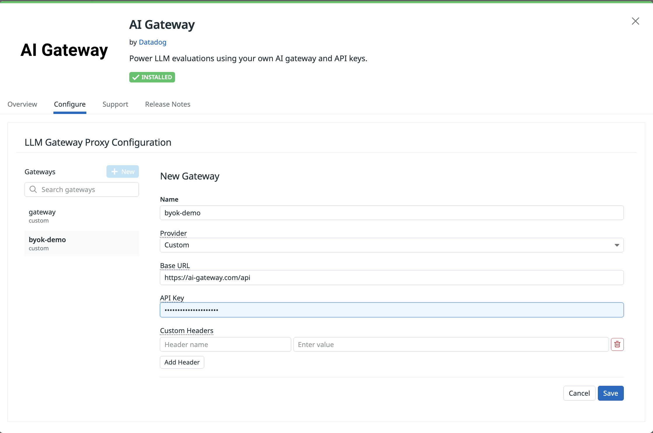 Connect your AI Gateway to LLM Observability with your base URL, API key, and headers.
