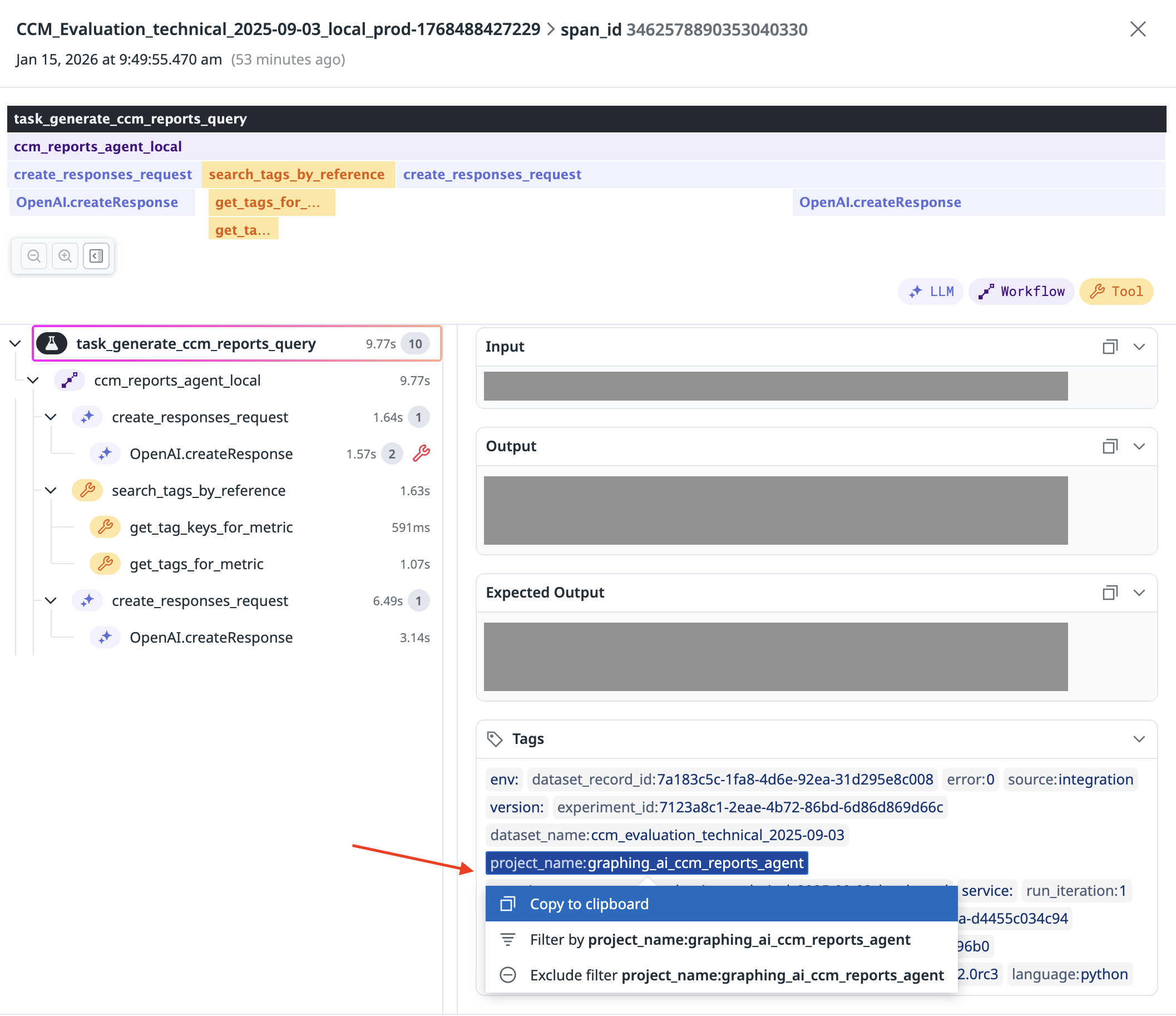 • Experiments spans and children spans are tagged with dataset_name, project_name, project_id, experiment_name for easier search.