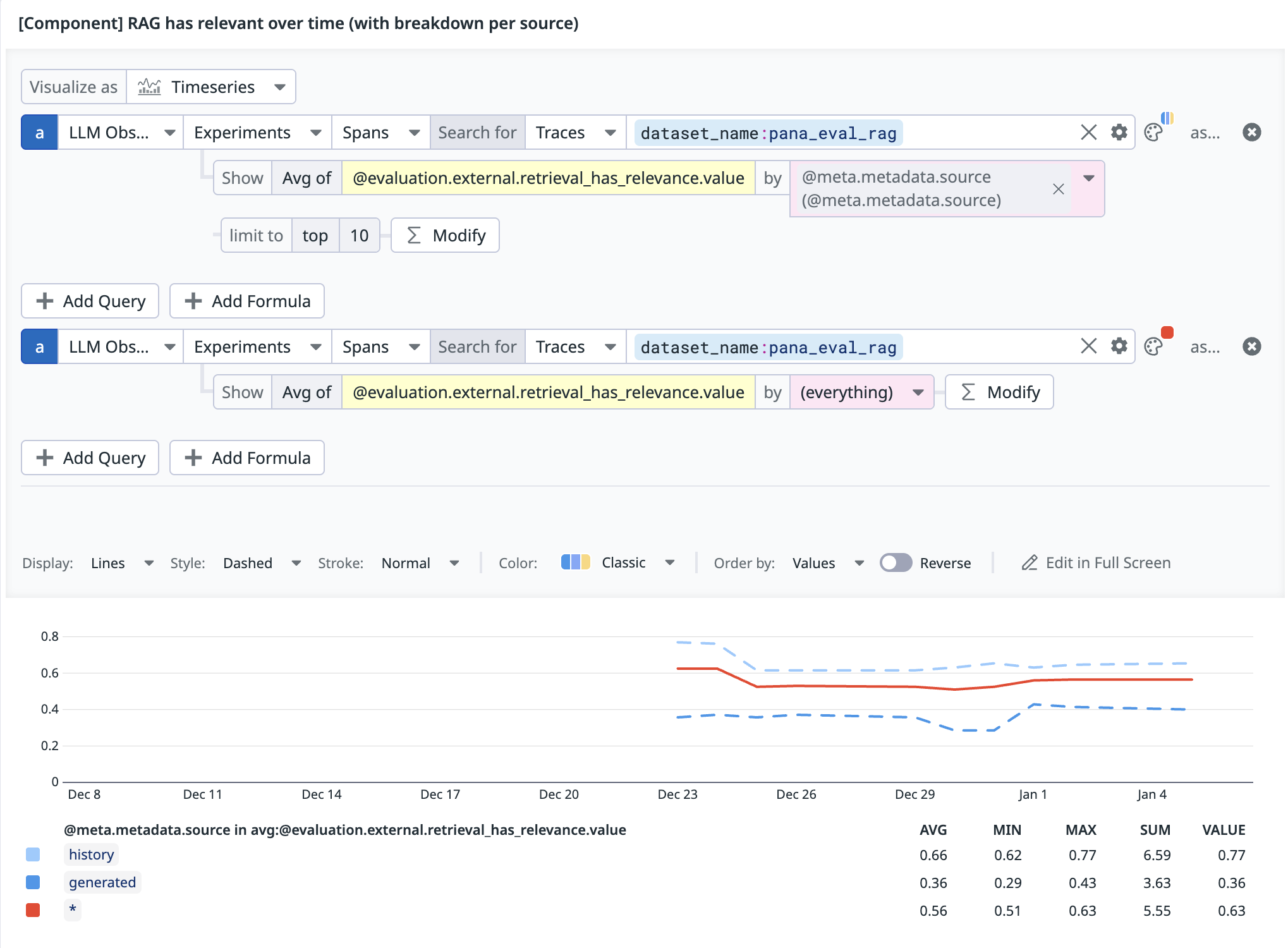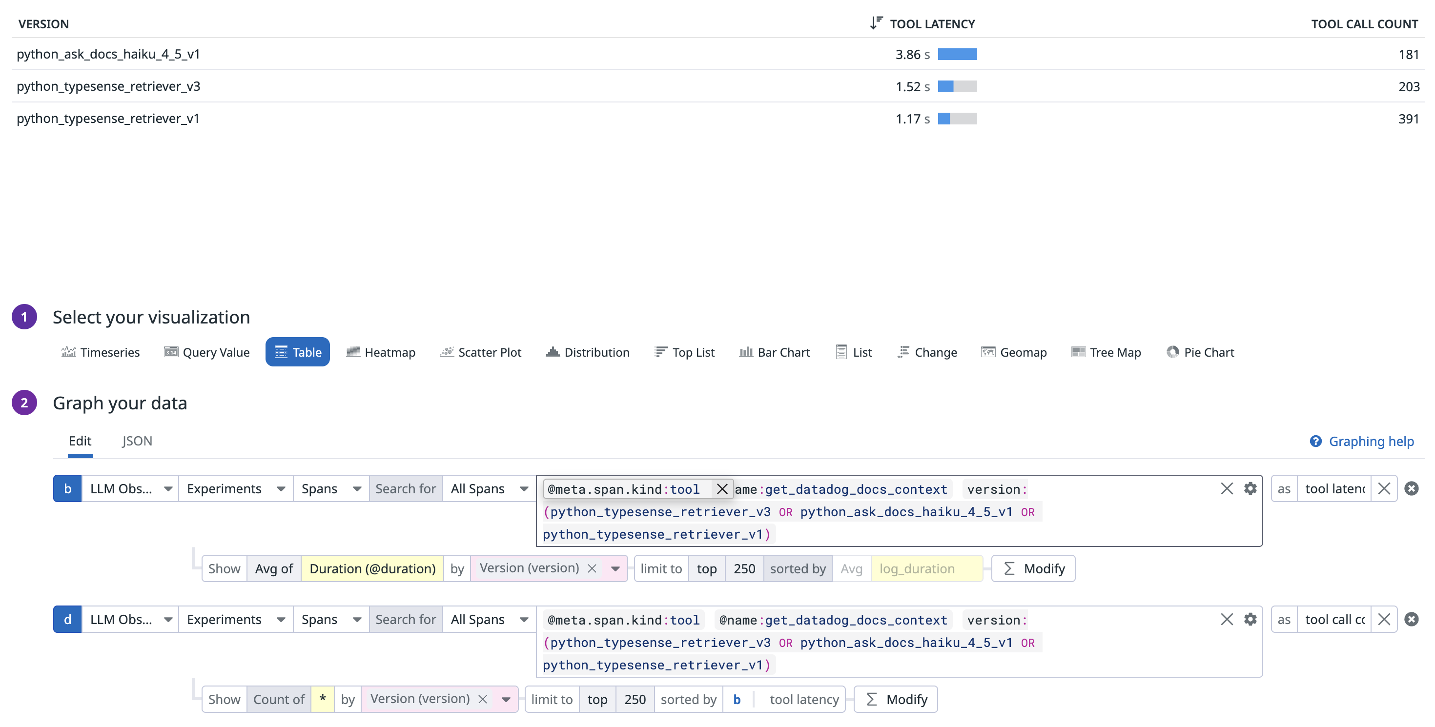 To build a widget using LLM Experiments data, use LLM Observability > Experiments as data source. Then, use the search syntax on this page to narrow down the events to plot.