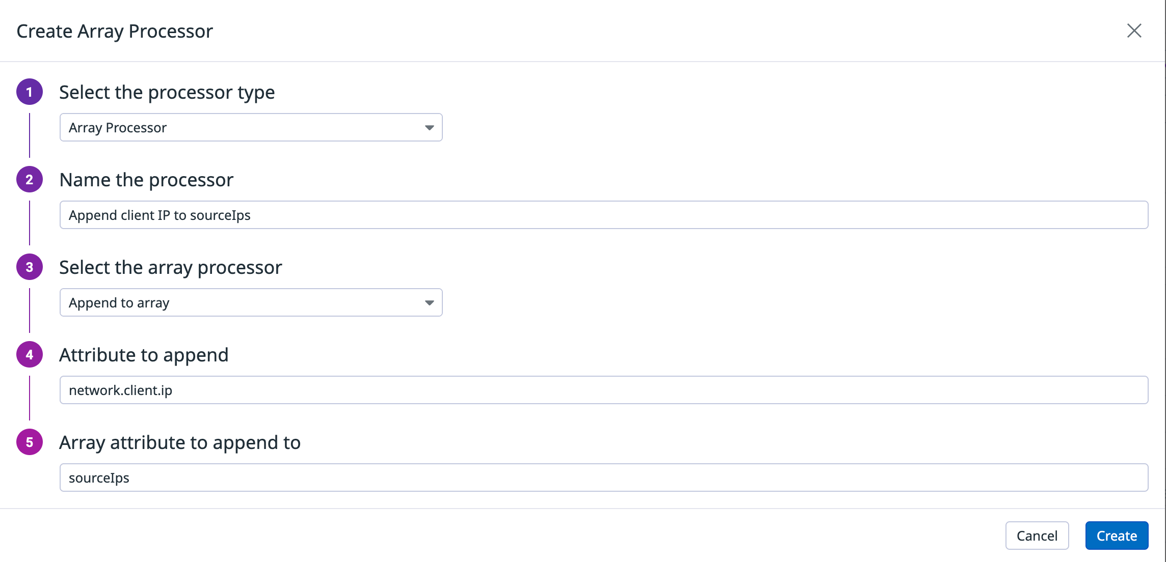 {"type":"array-processor","name":"Append client IP to sourceIps","is_enabled":true,"operation":{"type":"append","source":"network.client.ip","target":"sourceIps"}}