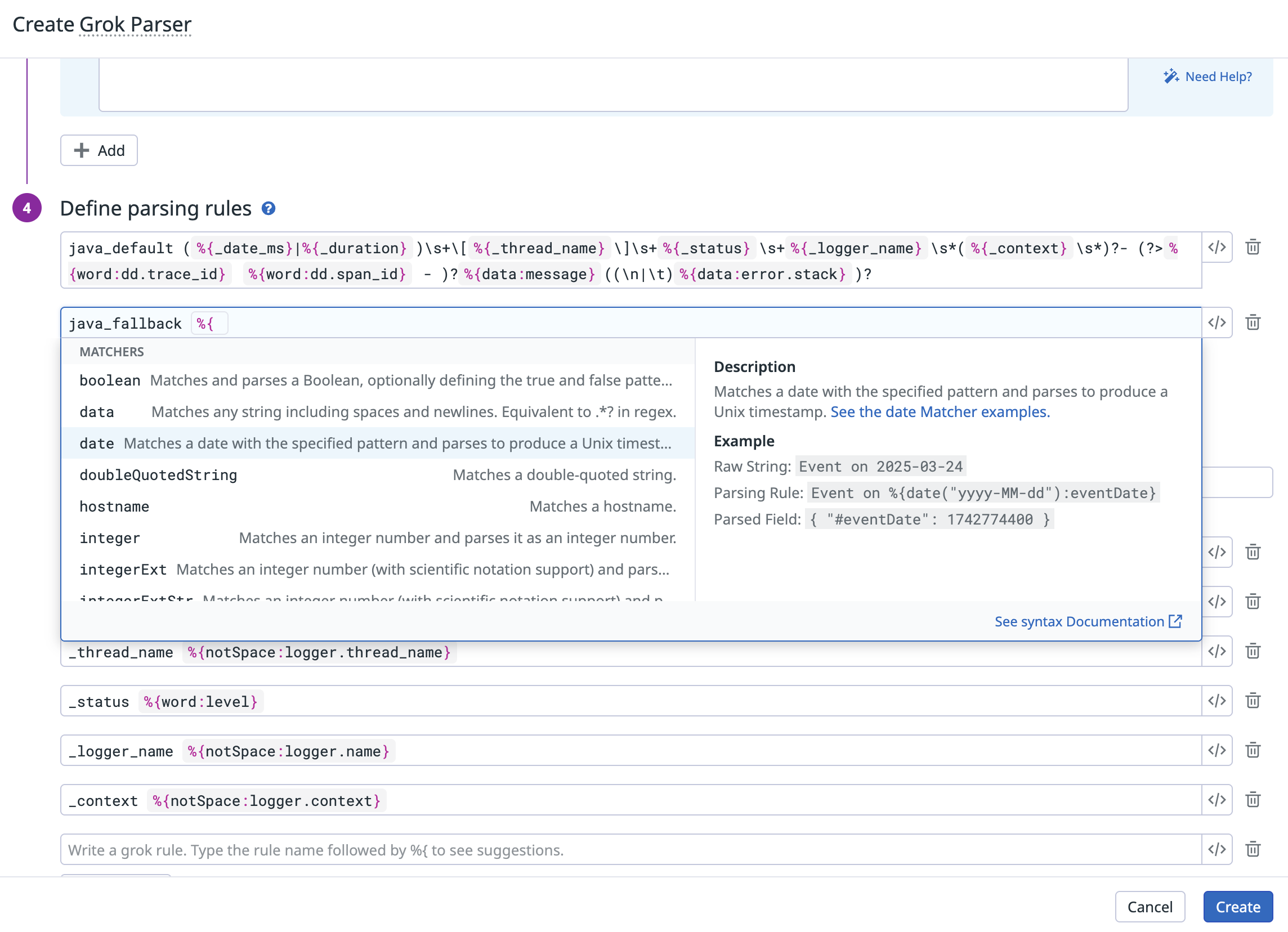 Define parsing rules: Write your parsing rules in the rule editor. As you define rules, the Grok parser provides syntax assistance: