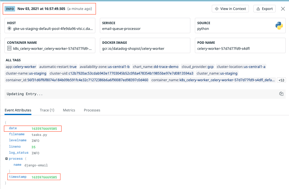 If your logs don’t have a timestamp that conforms to the formats listed above, use the grok processor to extract the epoch time from the timestamp to a new attribute. The date remapper uses the newly defined attribute.