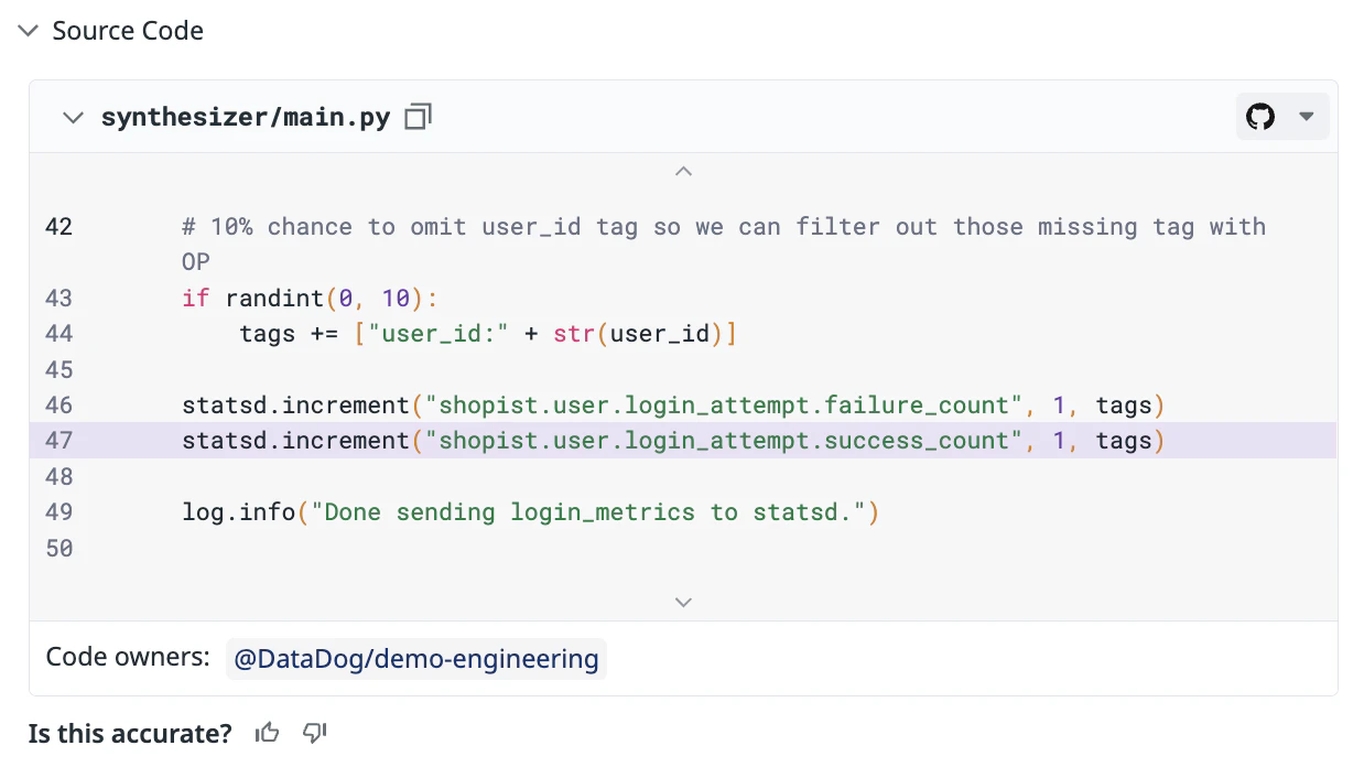 To ensure full coverage of your metric’s source code, ensure that you’ve installed Datadog’s GitHub, GitLab, or Azure DevOps integration and that all your repositories are connected.