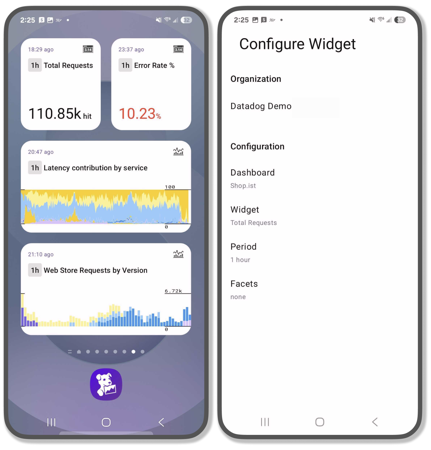 Add widgets on your home screen to quickly access real-time critical information directly from your home screen without ever having to open the Datadog mobile app.